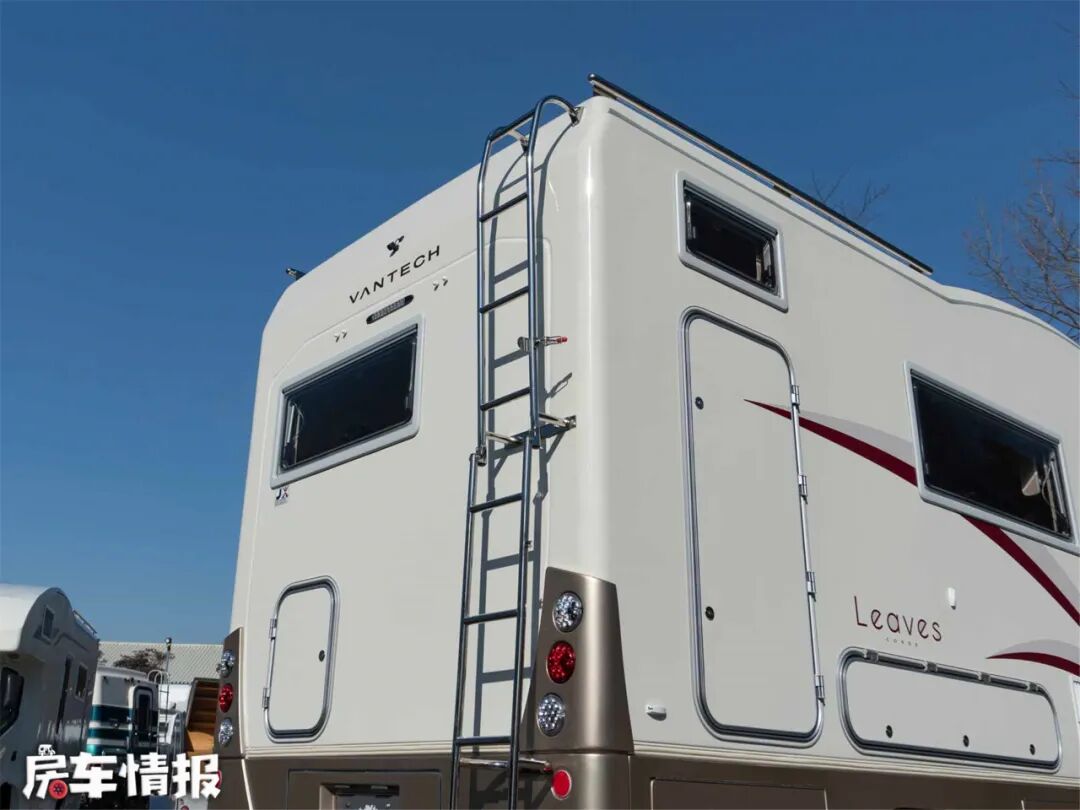 整车大小是4995*1980*2960MM,该车采用大额头设计,车身侧面设置了外推窗,还安装了行李架和后爬梯,方便运输大件行李物品。车尾部也带有可以打开的通风窗,增加了房车的通透性,上面的倒车探头和高位刹车灯,增加了驾驶安全性。