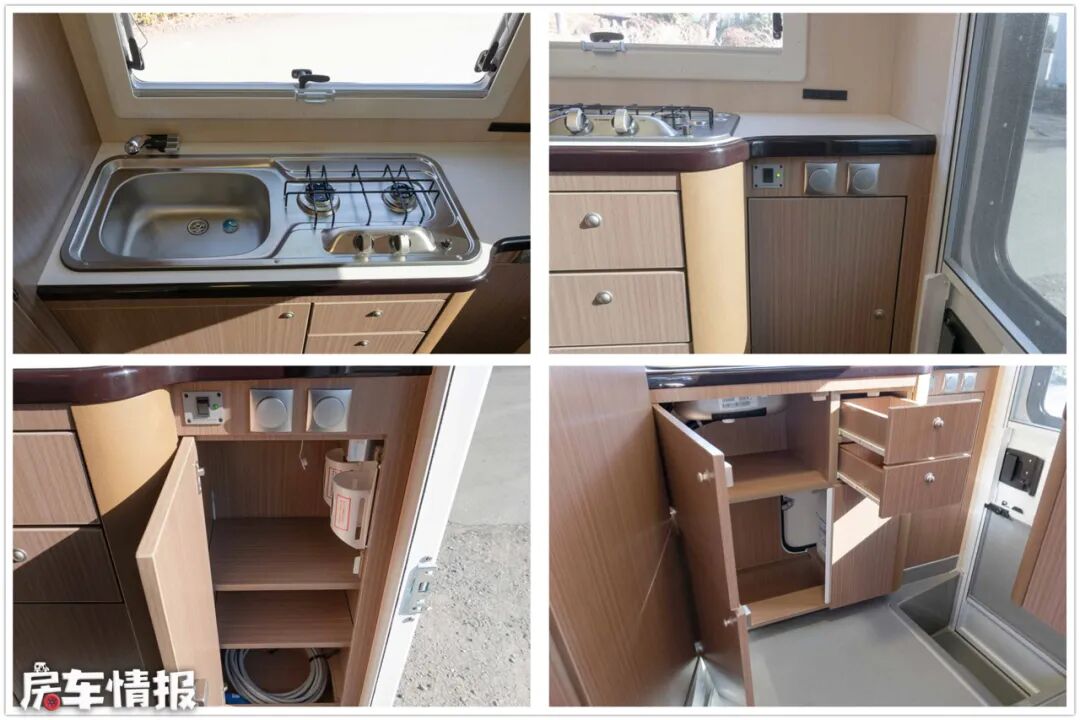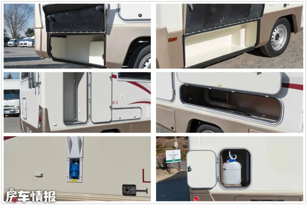 车外的储物空间比较丰富,车身两侧的裙摆箱、后部贯通储物仓,以及相应的水、电接口和燃气贮藏室,分类存放,布局清晰。