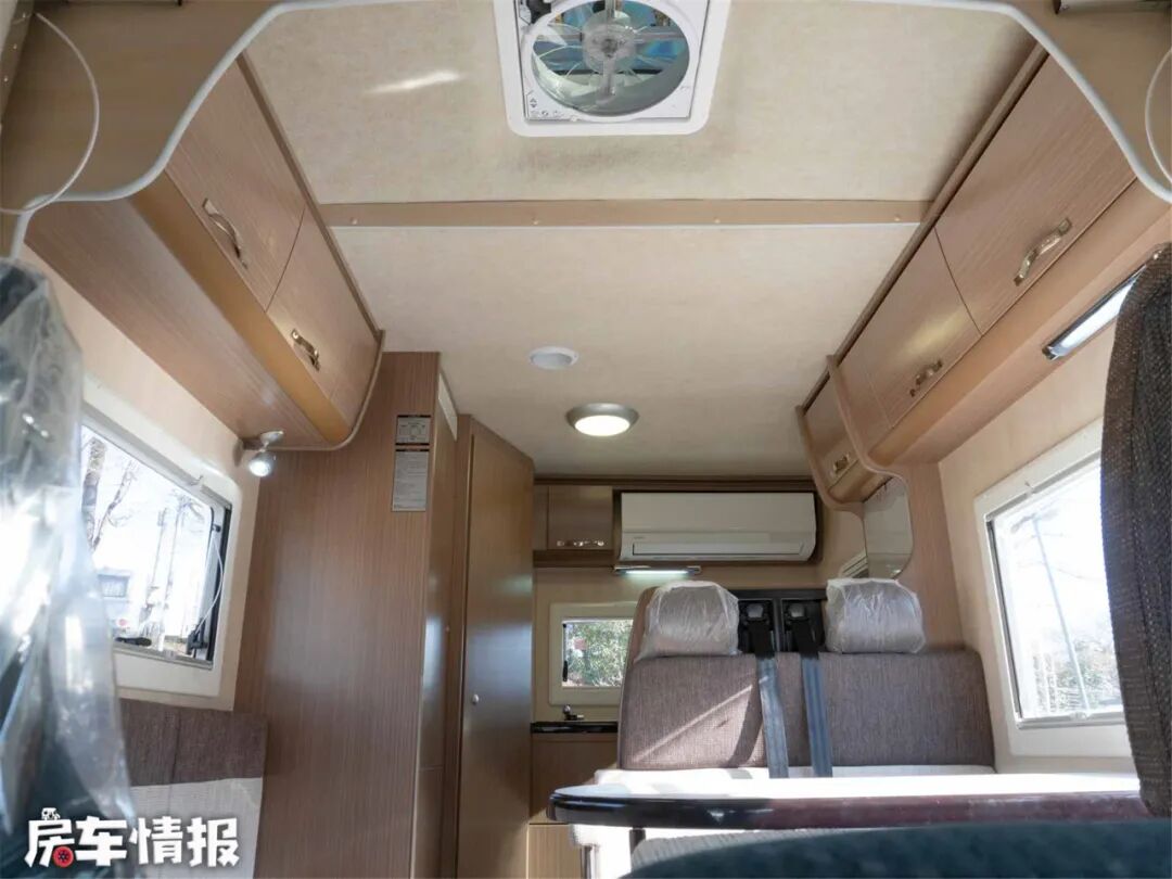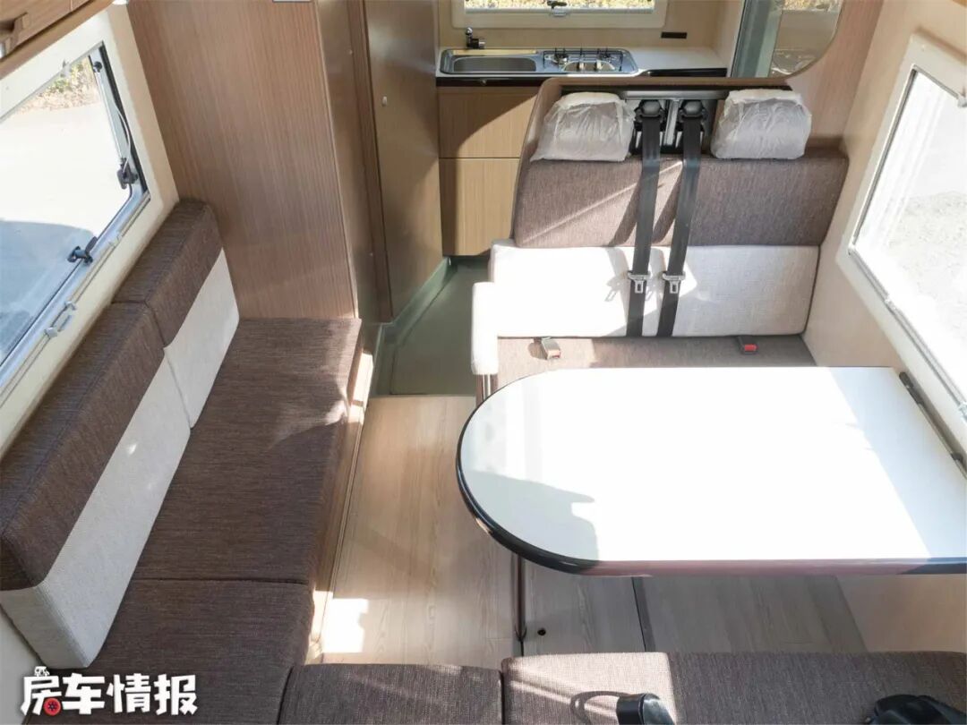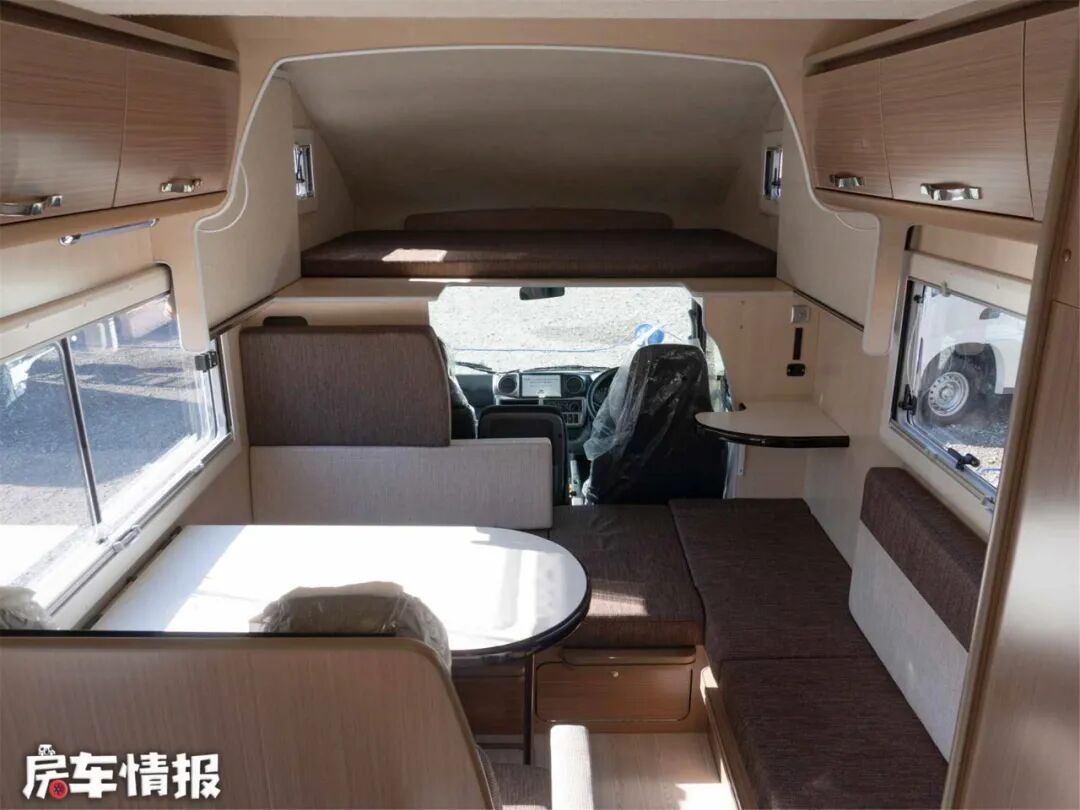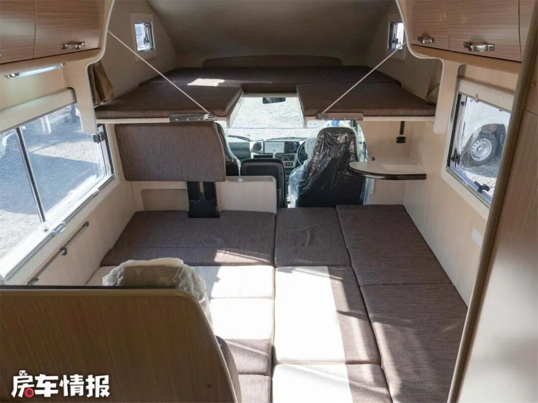 本车采用后开门设计,车内生活空间包括会客区、休息区和厨卫空间。休息区没有占用车内的固定空间,而是由卡座拼成的沙发床变换而成,在配合驾驶舱顶部提供的额头床,实现了双层床铺空间,达到了7座5卧的内部格局。
