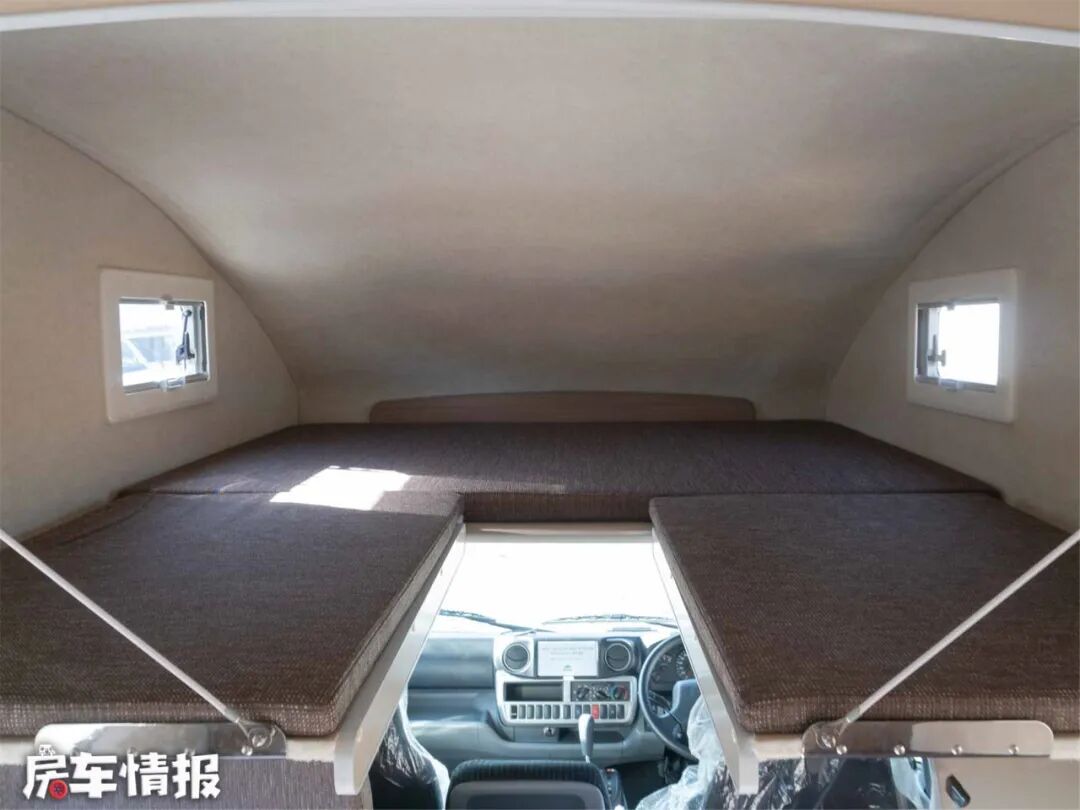 顶部的额头床,由一套上、下折叠的床板组成,白天不用可以轻松收起来,方便驾驶室过人。额头床左右两侧分别有迷你外推窗,有着不错的采光效果。整个二层床都采用了舒适的软包处理,改善了睡眠体验。