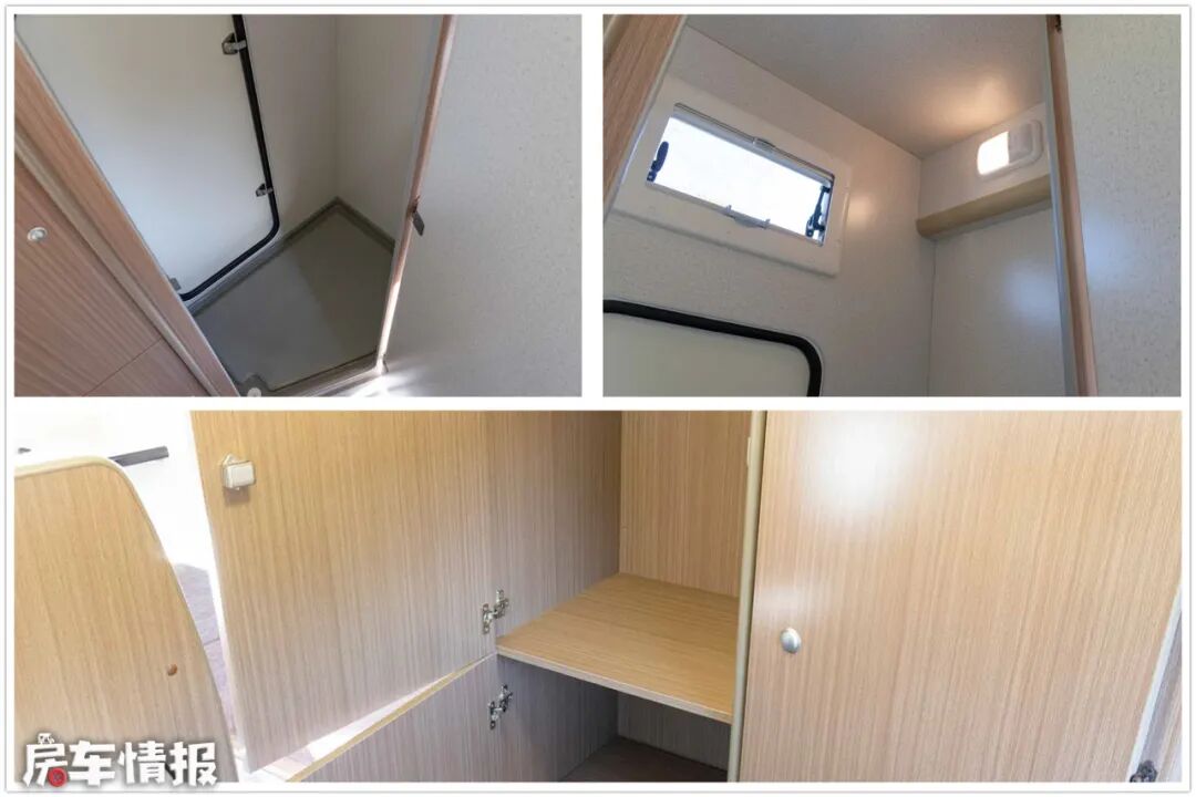 多功能卫生间设计成了一体式的组合柜,整个柜子一分为二,左侧是上下双开门的衣橱,右侧是一体高柜,平时当作衣柜和储物大件行李用,与车外储物门相通,非常方便。高柜内部设置了小侧窗,地面带有防水垫和排水口,在额外配上便携式坐便器和便携式淋浴装置,就可以使用卫浴功能了。