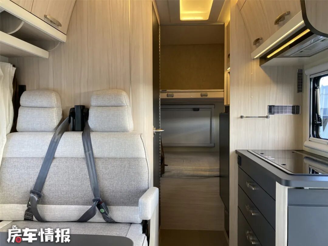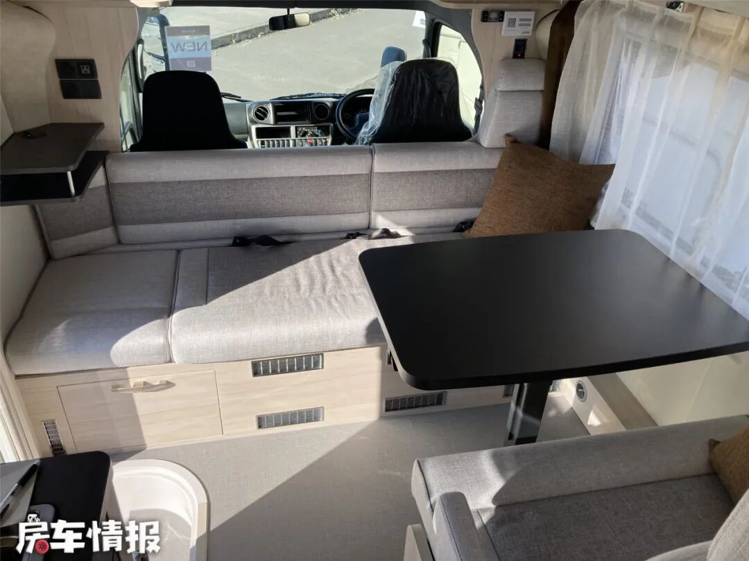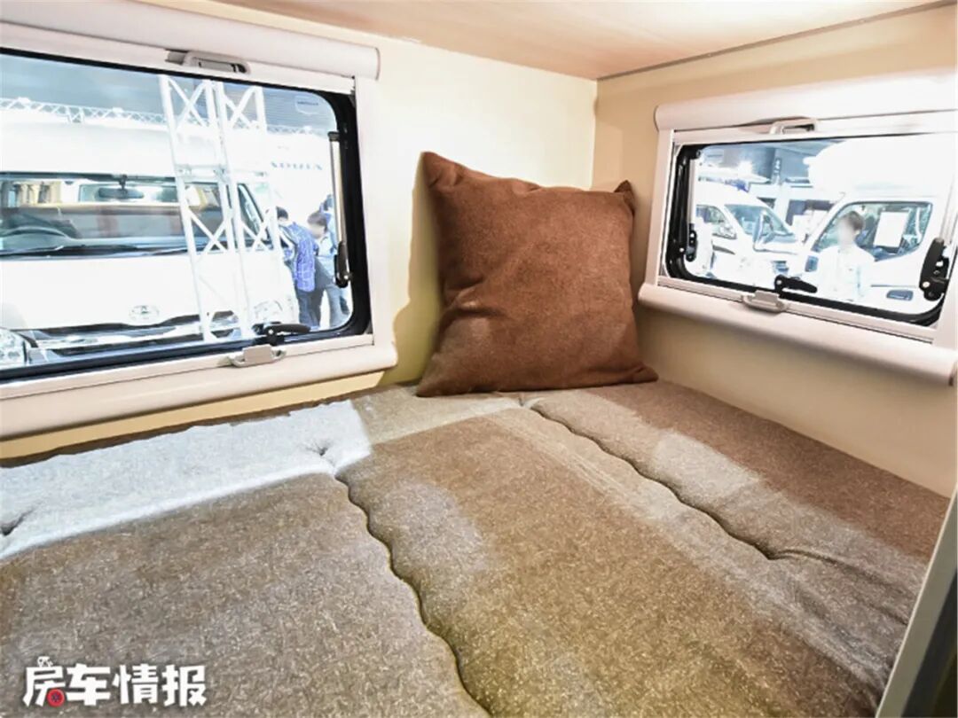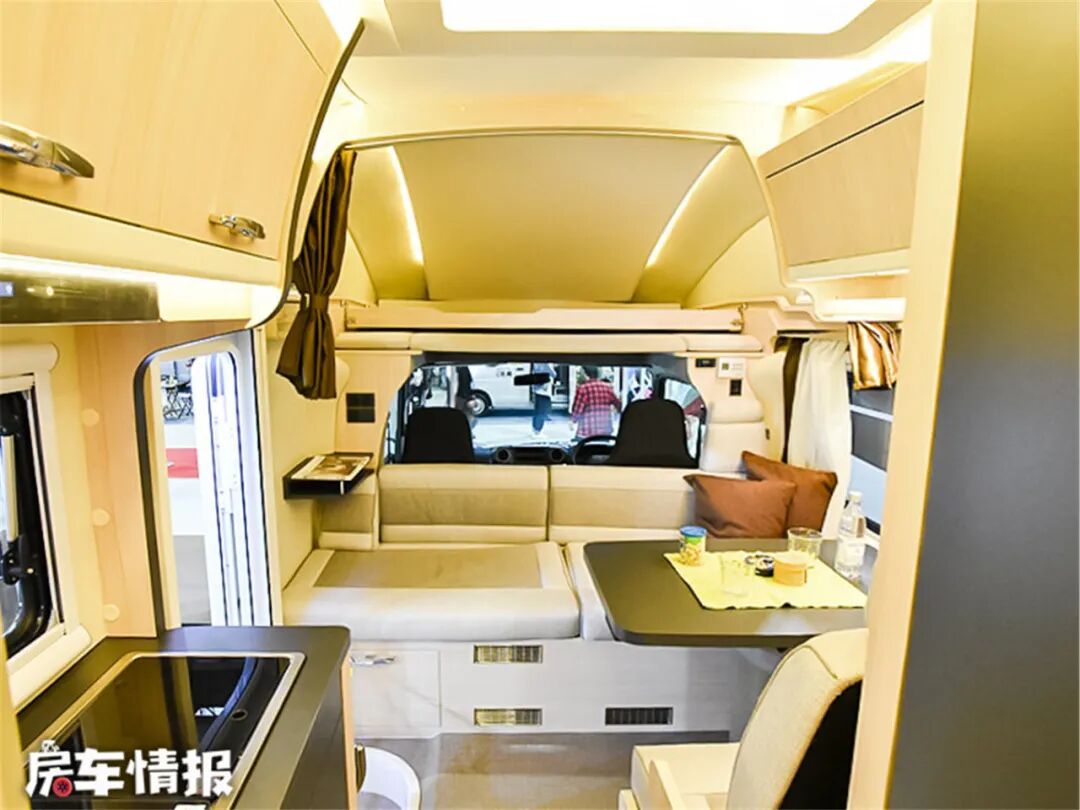 车内生活空间比较宽敞,由会客区、休息室和厨卫组成,布局清晰。车内的采光和通风效果明显,车身侧面安装了比较大的采光窗和遮光帘,顶部还有天窗,以及双向换气扇,保持室内外空气新鲜。