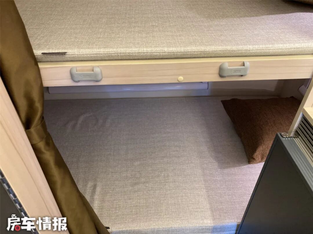 休息区由车尾的固定双层床和前面的额头床组成,车尾上下铺大小都是1920*840mm,下层床铺三面环窗,底座还带有小的储物箱,可放置手机、Pad等随手物品。