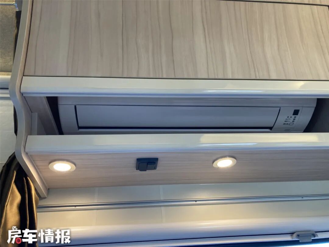 采暖系统还可用于加热清水箱,与使用普通加热器不同,它可以持续加热热水保持不中断。因此即使在寒冷的天气淋浴,也非常舒适。暖气属于完全燃烧和强制排气型,因此可以持续的保持室内的空气清洁。顶柜的后面,隐藏着一台家用空调,既实用又美观。