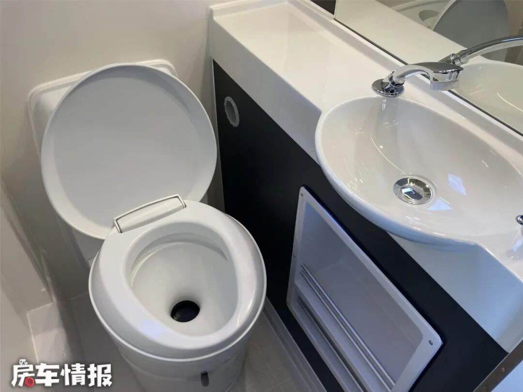 厨房位于车的中部,装备了带盖的不锈钢集成灶具,带有双眼燃气灶+不锈钢水槽+l折叠水龙头,关上盖子后就变成了长方形的操作台,又卫生又安全。灶台还带辅助桌板,确保烹饪空间。灶台旁边带有90L冰箱(内置10L冷冻柜),还可根据需要扩展一个额外的抽屉式冰箱,放更多食材。此外,还安装了微波炉和抽油烟机,方便食物料理。
