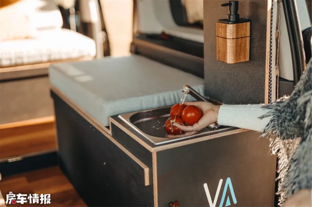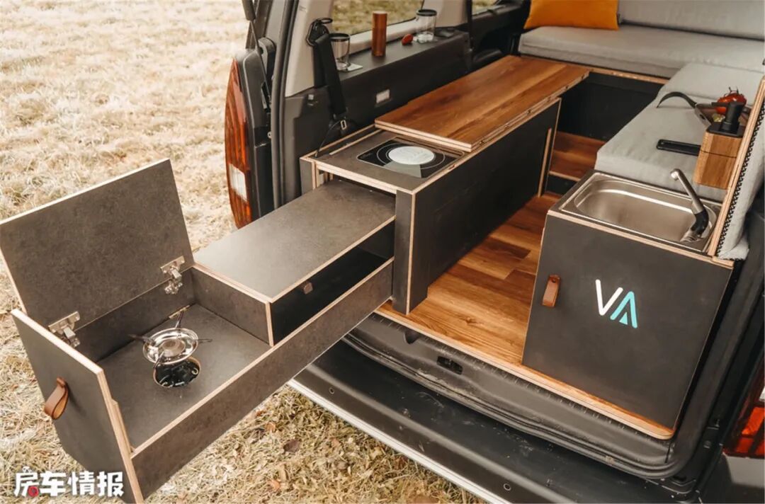 虽然空间不富裕,厨房部分却采用了双源设计,而且是室内、室外公用,设计比较新颖。灶台上内嵌着电磁炉,同时下方隐藏着抽拉燃气灶,可选择在室外或者室内使用双灶做饭。另一侧的卡座下方,还隐藏着不锈钢水槽和折叠式水龙头,白天不用时,还可以当作置物板使用。
