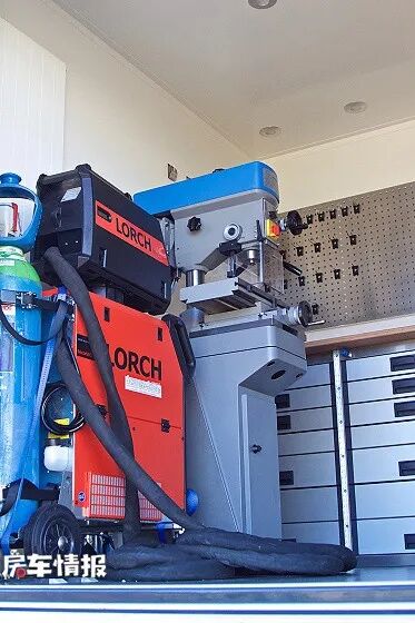 打开车厢尾部门,则是一个独立的工作室,内部不仅提供了各种手工工具、电动工具、气动工具甚至还有移动式电焊机和一步车床,完全就是一个微缩的车间,当需要用到某种工具时,完全可以自己动手制作,想起来都觉得雄性荷尔蒙爆棚。
