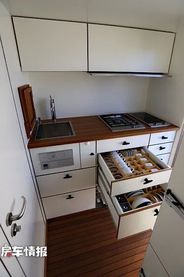 车内厨房提供了电磁炉、燃气灶、微波炉、抽油烟机以及195L超大容积的房车专用冰箱,同时还带有独立的冷热水系统,净水箱达到了900L,灰水箱为220L,并且还带一个60L热水器。