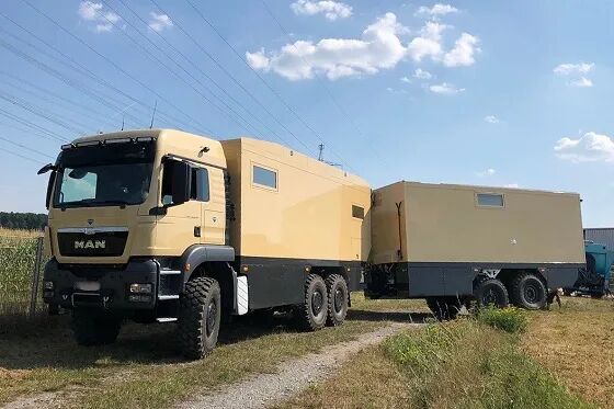 这件设备就是由鼎鼎大名的UNICAT房车推出的一款拖拖挂式房车,和我们常见的拖挂式房车不同的是,这辆车只能由德国MAN、奔驰阿洛斯等重型卡车来牵引,也因此它注定只属于这类房车车主。
