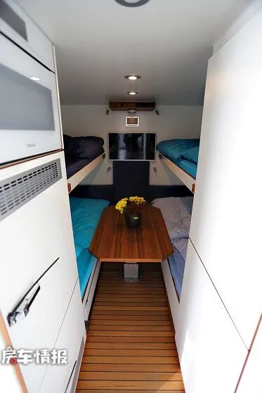 车厢右侧和尾部分别设有一个舱门,目的是在箱体内打造出两个独立的空间,从常规侧门进入后,是一个独立休息区域,这里不仅提供了4张尺寸约为2000*800mm的单人床,同时还提供了一个干湿分离卫生间以及一整套厨房设备,在这里做饭,就可以避免把前车弄脏。