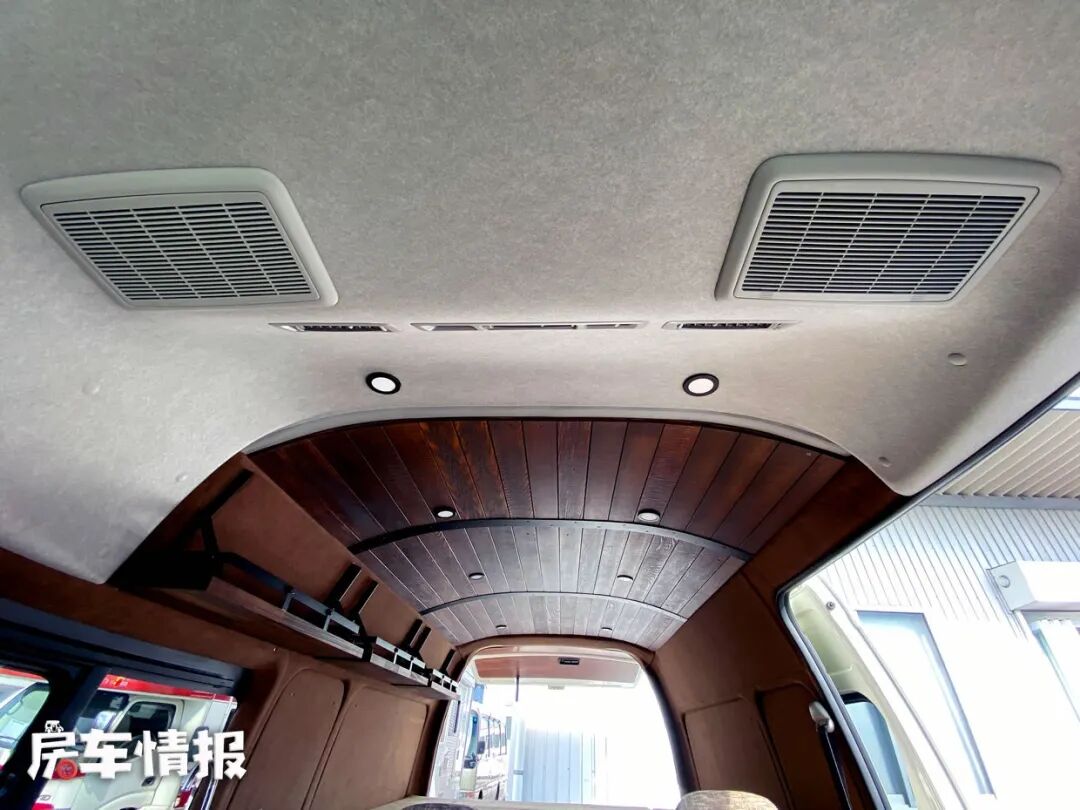 在车厢后方配有行车空调的出风口以保证车辆内部的温度,同时原木设计的车顶看起来非常清新,有一种逃离都市生活去野外放飞的感觉。