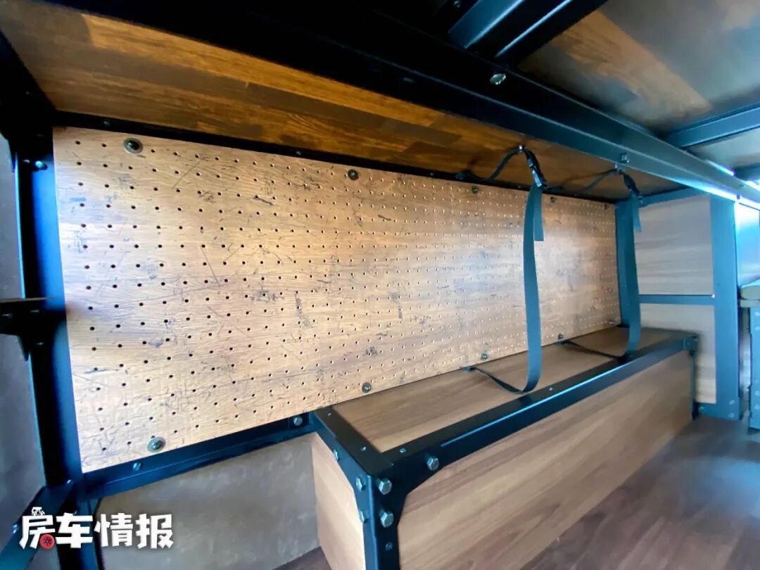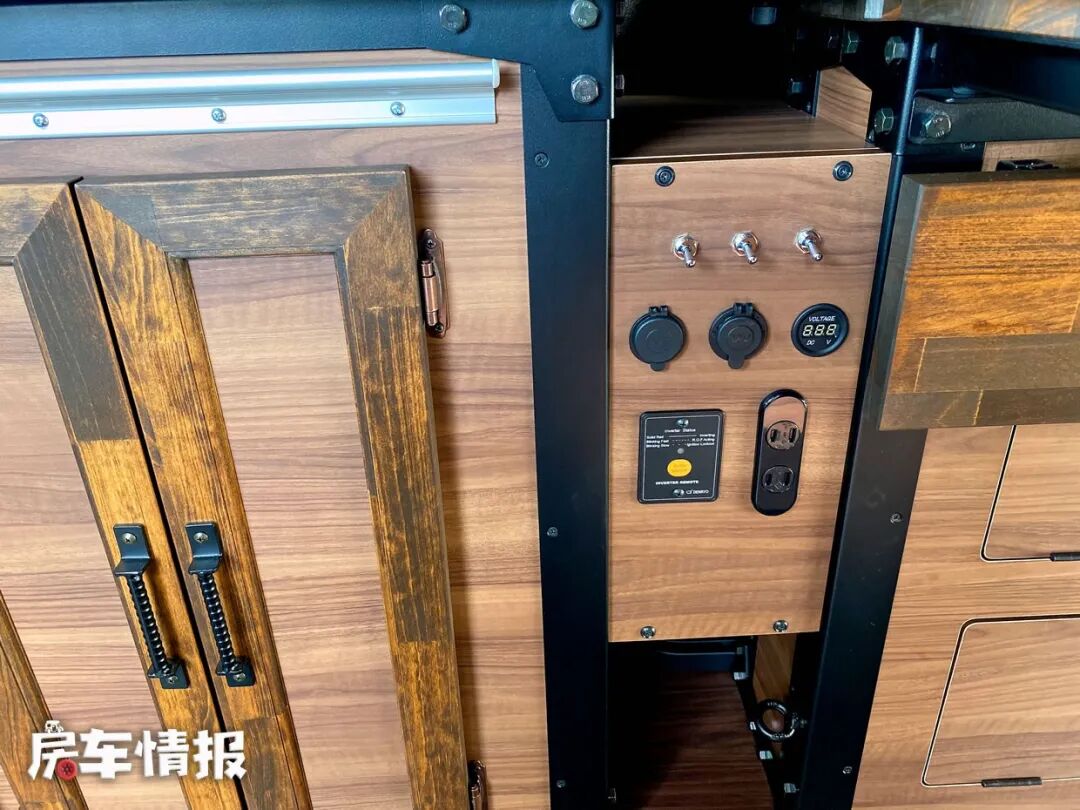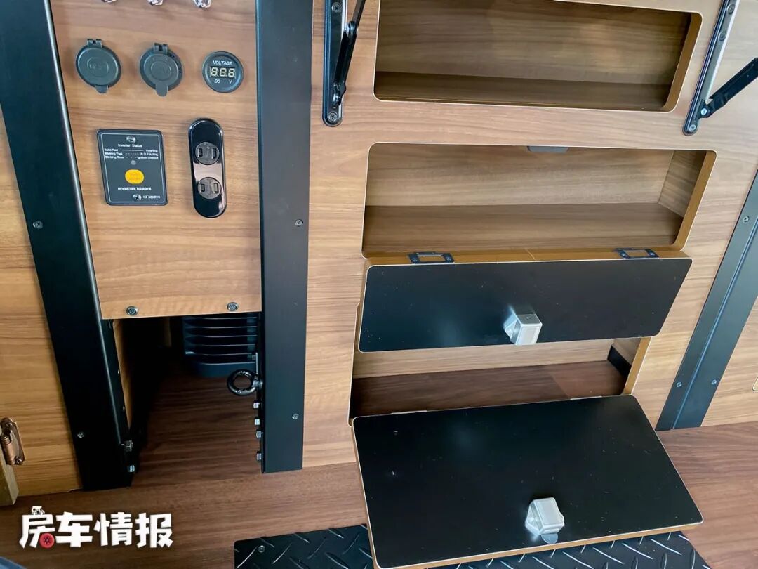左右两侧柜子集成一些储物空间和电路系统,车内有1500W逆变器和100Ah生活电瓶。