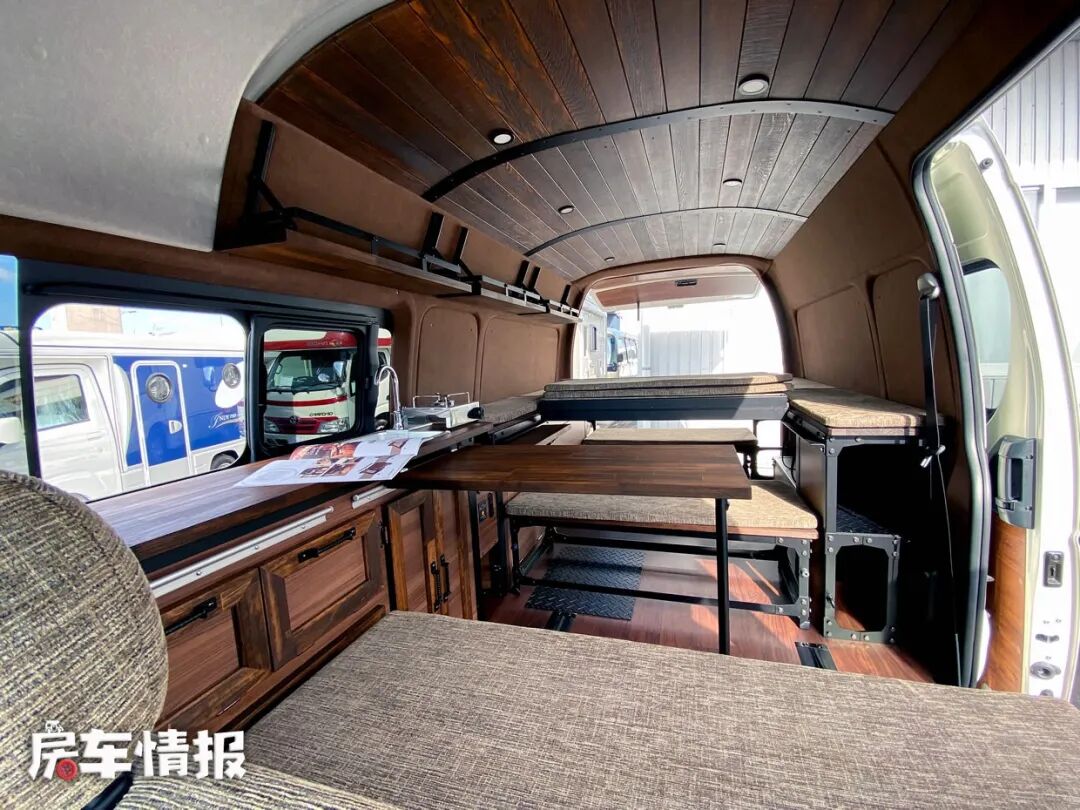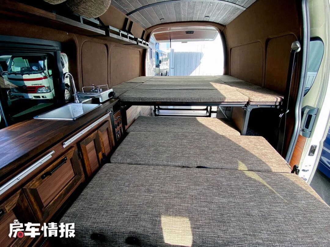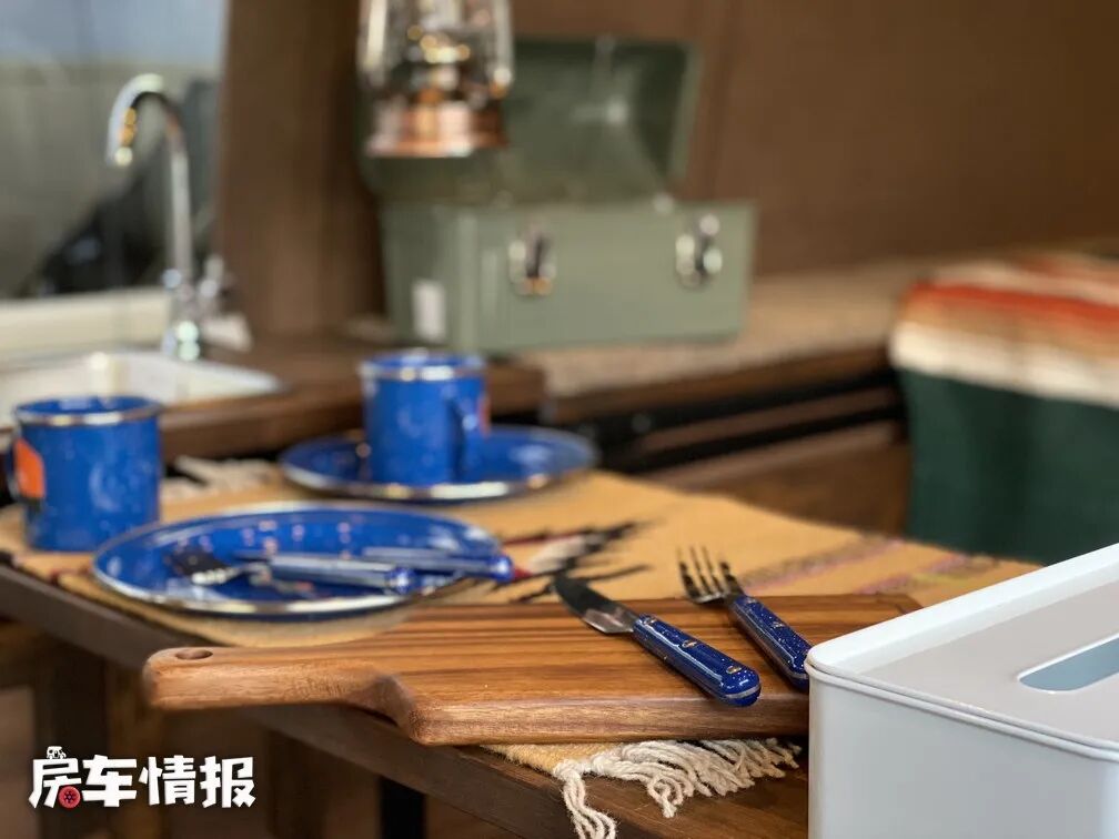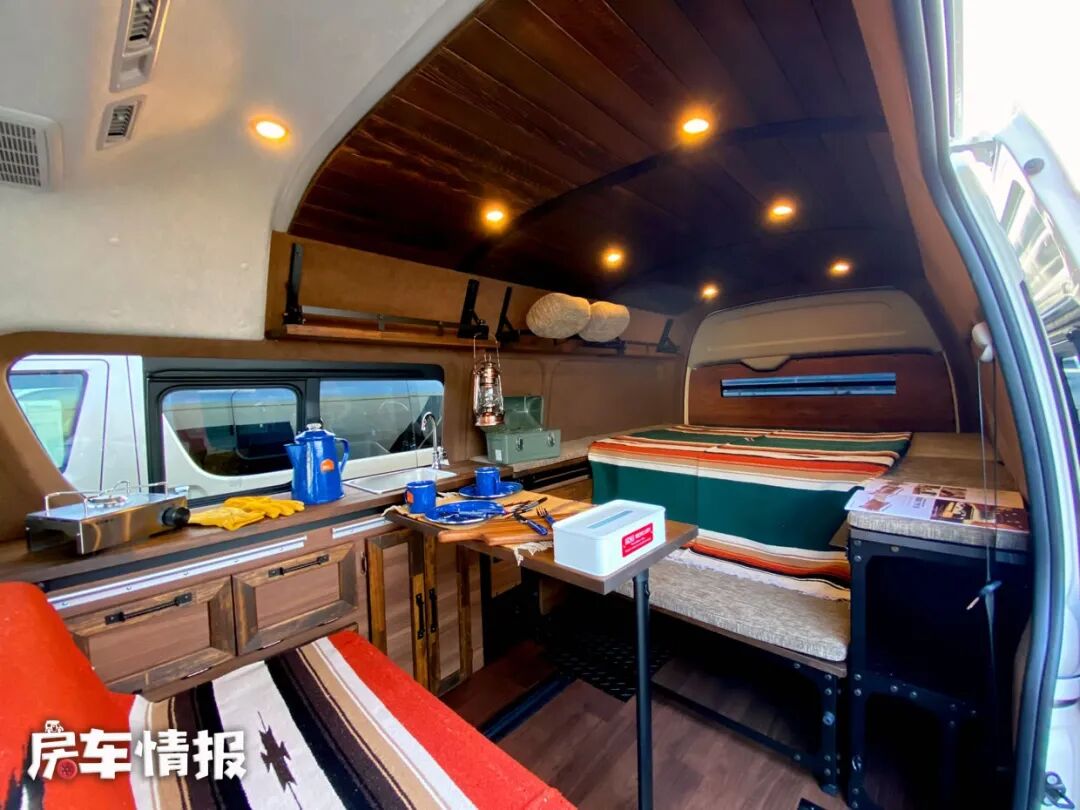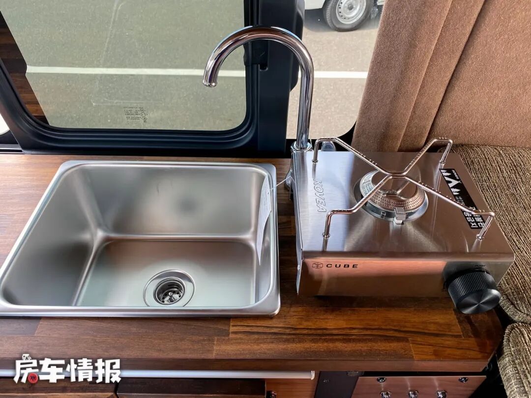在车辆右侧操作台上方还配有洗手池和炉灶,可以在车内制作简餐。