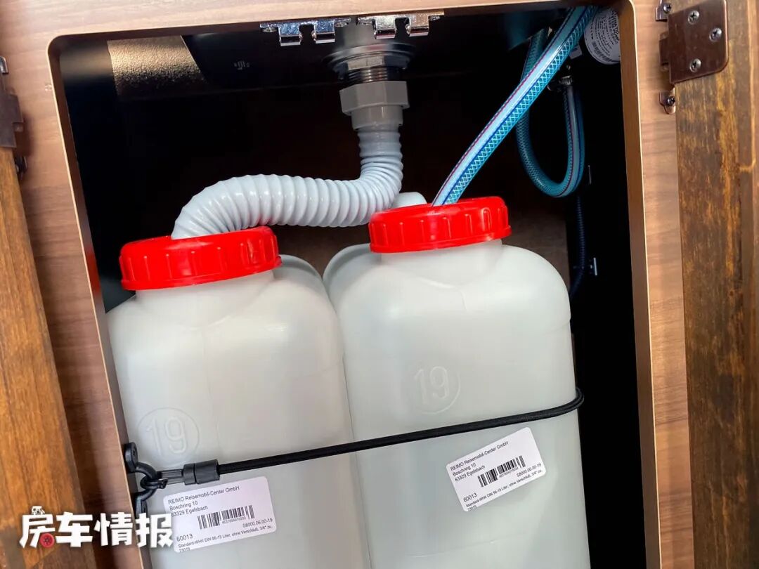 下方是日本房车上常见的可移动水箱,分别四19L的清水箱和19L的灰水箱供日常使用,并且清洁起来也很方便。