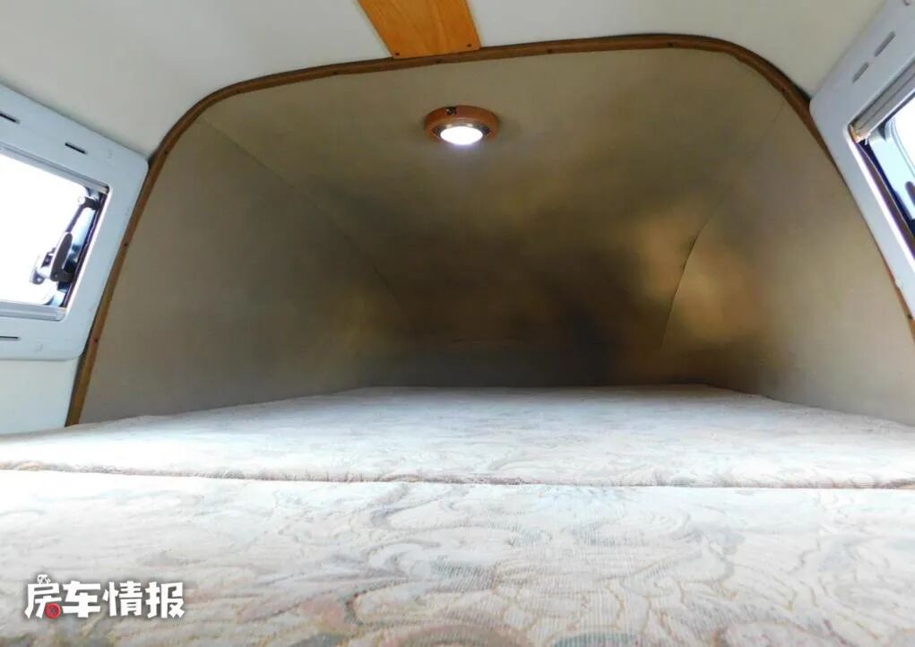 来到车身顶部的二层空间,这里是一张平整的双人床,尺寸差不多达到了2000*1200mm,可以轻松满足2名成年人休息,不过受限于较矮的造型,垂直空间并不是很充裕,成年人想要坐直基本上是不肯能的。