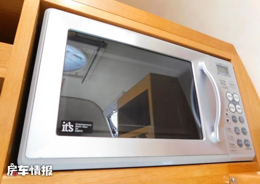 在二层的内侧还提供了一些小的储物格,便于在休息的时候把一些随身物品、首饰存放进去,避免在睡一觉之后找不到自己的东西,这里还提供了微波炉可供使用。