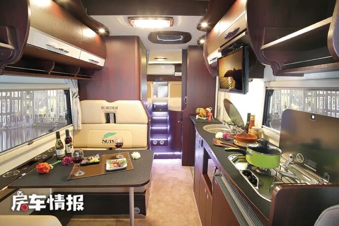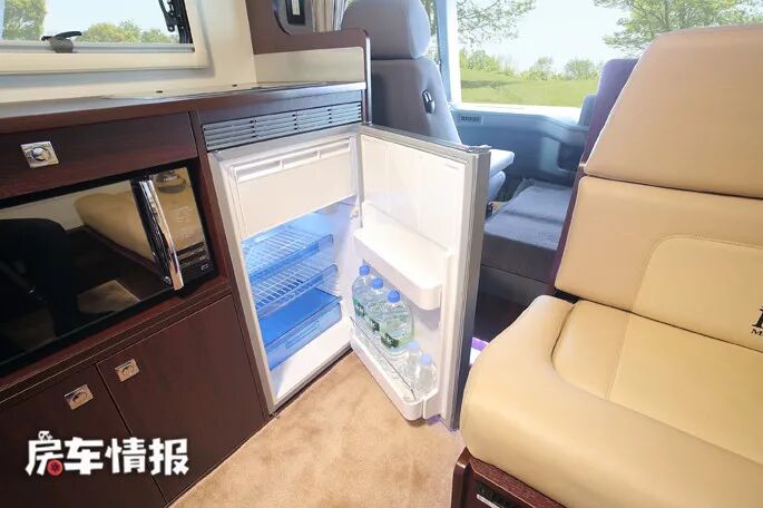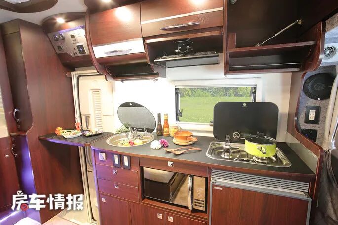 位于卡坐沙发对立的是车内的厨房区域,由于这款车的侧门位于车厢中部,因此厨房位置被放在了驾驶室后方,厨房内提供的设备非常齐全,不仅有常规的洗手池、冰箱、抽屉、微波炉,就连日系房车里十分罕见的燃气灶和抽油烟机也一并配齐,由此可见这款房车的定位是十分高的。