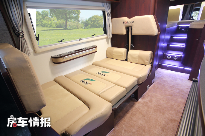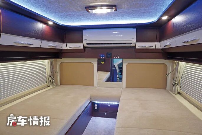 来到车厢尾部,是车内的主休息区,常规状态下是两张单人床,尺寸分别为1900*800mm,就像酒店标间一样分列在车厢左右两侧,可满足两名成人休息,有意思的是由于床位的高度较高,在两张床中间过道还设置了带有氛围灯的台阶,便于上下床。