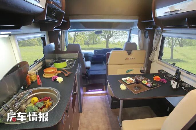 驾驶室后方区域是车内的会客休息区,这里提供了一组四人对坐沙发,可以满足四人在此休息聊天,四个座位均带有安全带,行车时也可以乘坐。
