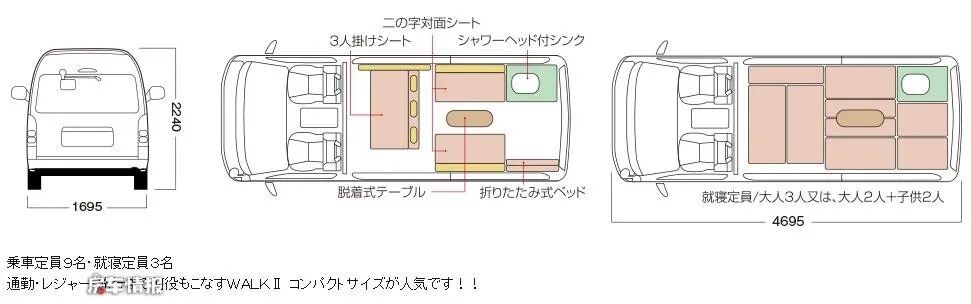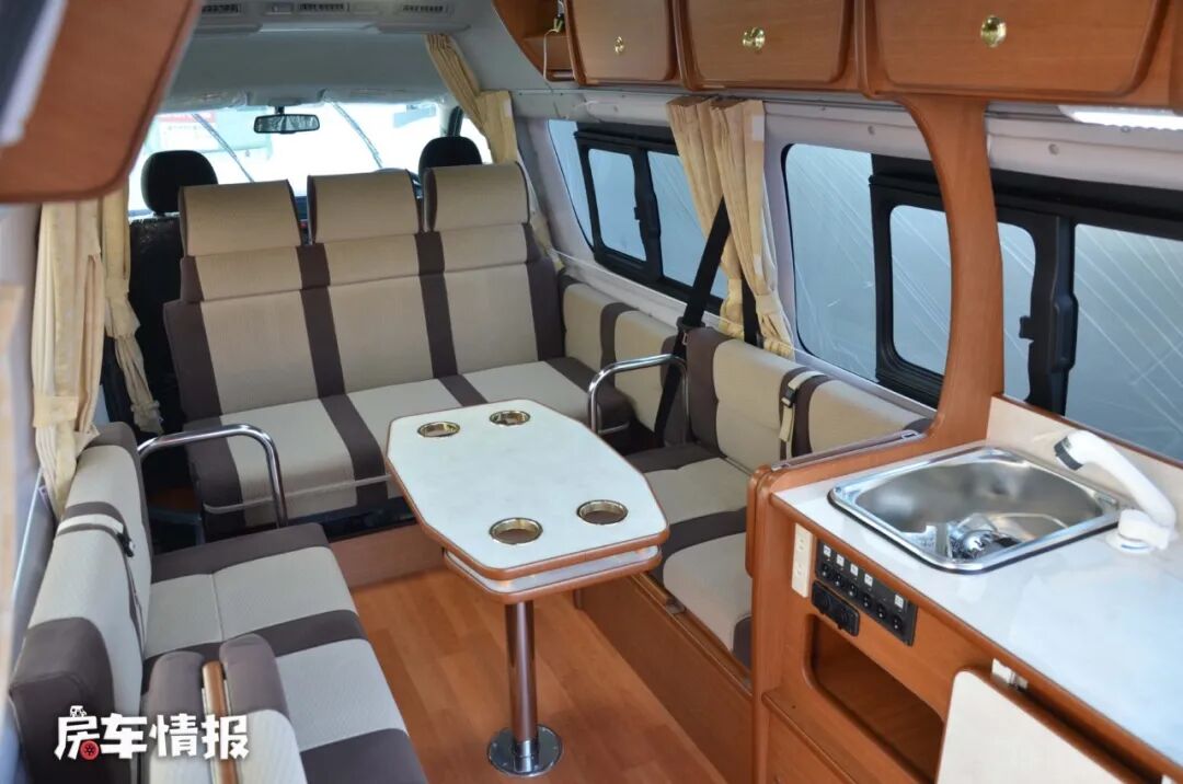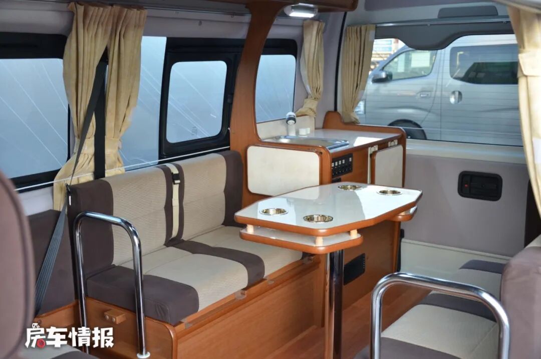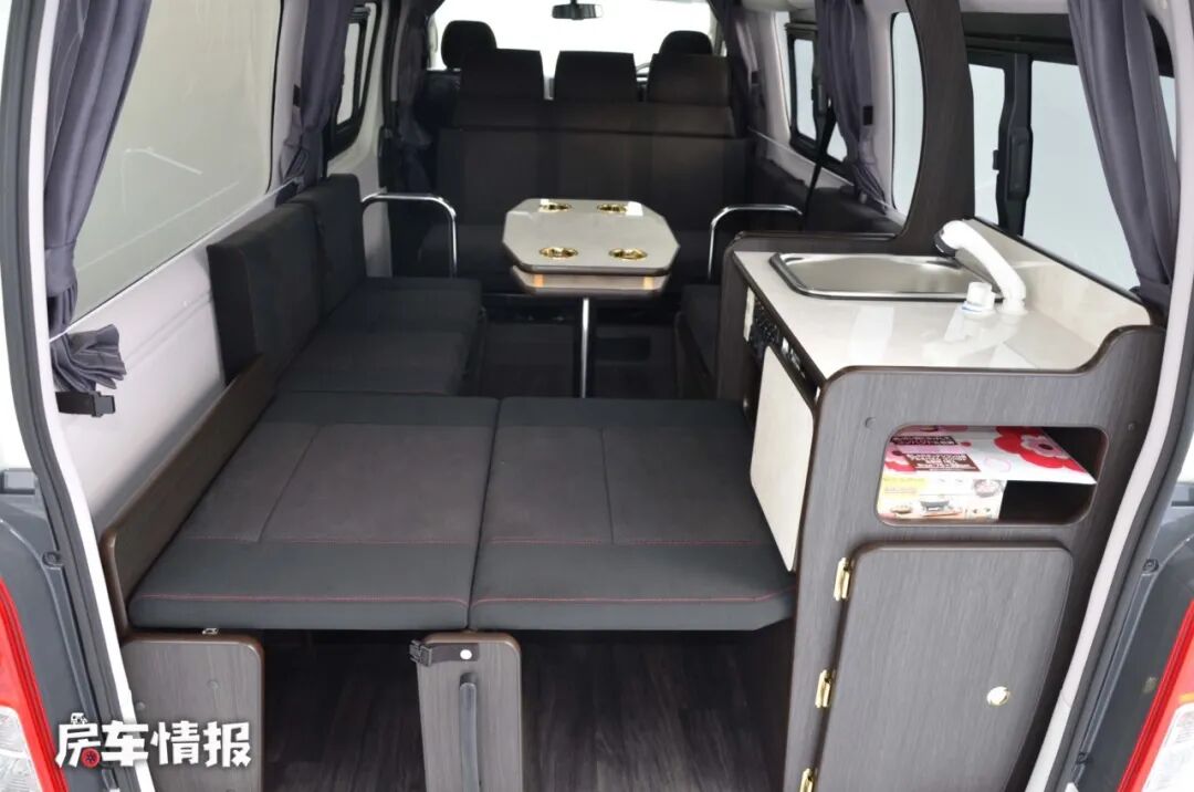 从车辆的布局图基本可以看到车内的情况,除了驾驶室以外在车厢内部还可以坐7个人,当夜晚休息的时候整个车厢都可以变成一张床铺,满足2大1小的休息空间。