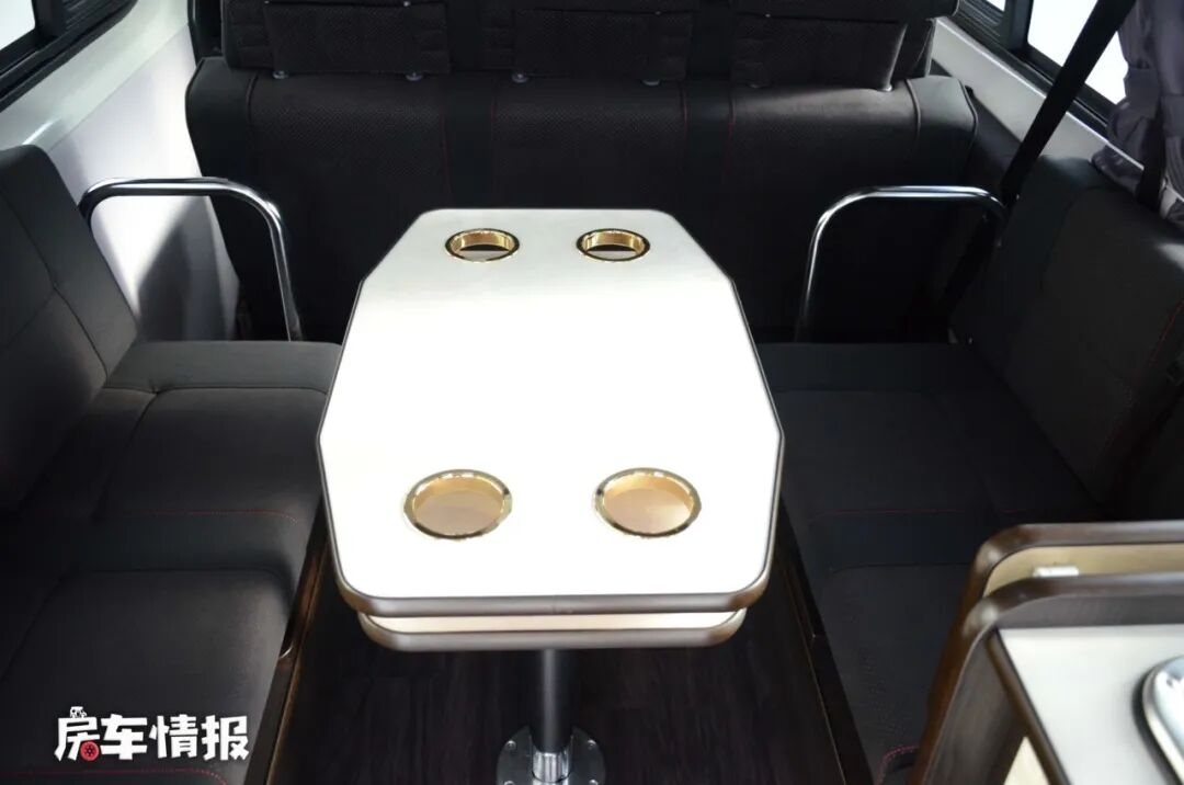 驾驶室后方是倒座式的3人座椅,与会客区的四人卡座组成了一个环形休息区,可在此最多坐7个人。