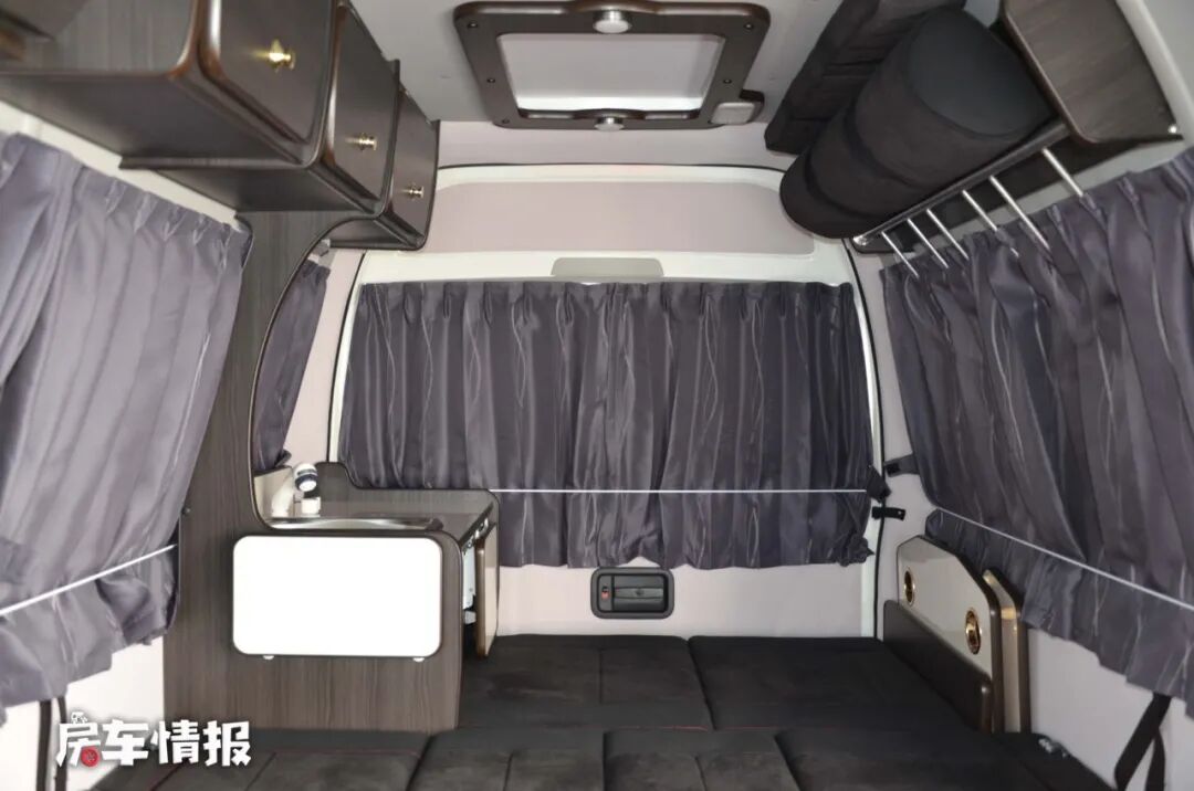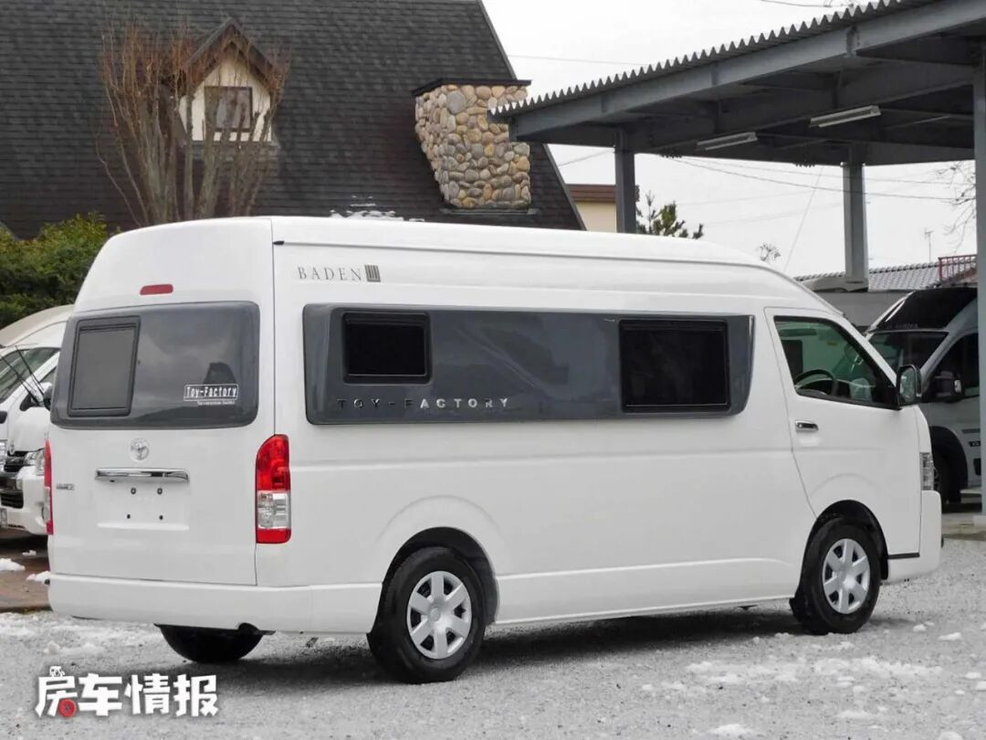 这款房车在外观上没有什么特殊之处,就是基于丰田海狮打造的一款B型房车,但是在车窗部分做了外拓处理,可以增加一部分车内的使用空间,并且采用隐私玻璃,车辆的长宽高分别为4695*1695*2240mm,基本和家用小轿车差不多了,非常好停放。