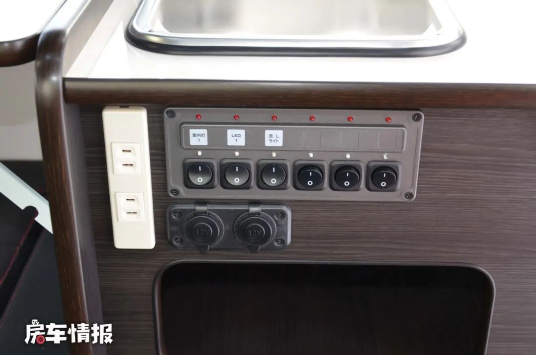 房车的控制面板在厨房下方,可以在这个位置控制车内灯光等,同时还配有直流充电口和交流充电口,用以使用电器产品,这款车的水箱是日式房车上常见的可以拆卸的水箱,分别是10L的清水箱和10L的污水箱,便于日常清洗。