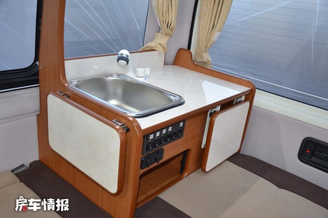 在车辆的尾部带有一个独立的厨房,操作台两侧都可以拓展,增加使用空间。