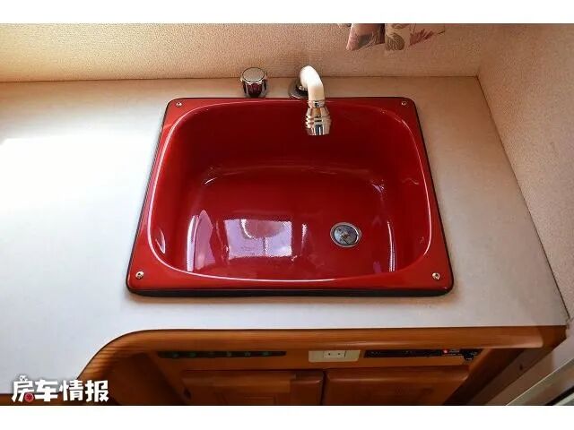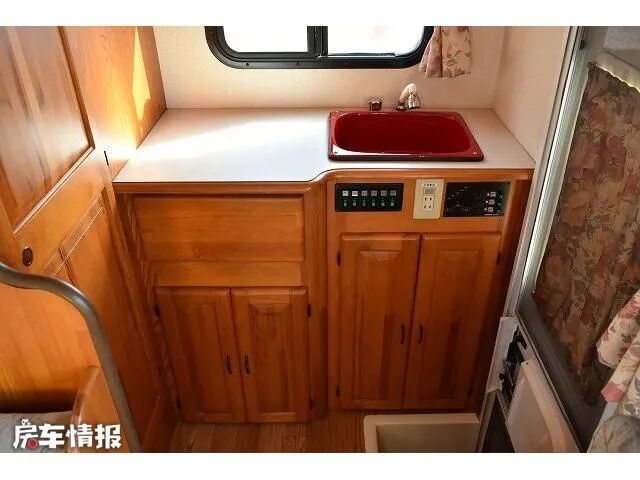 车尾部配有一个简易厨房,上方是洗手池,下方配有交流电电源插口,可以在此处使用一些生活电器,比如电磁炉、电饭煲等。