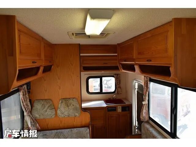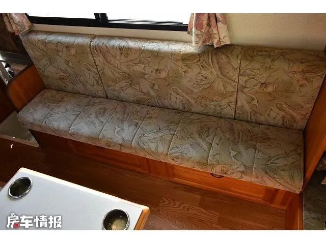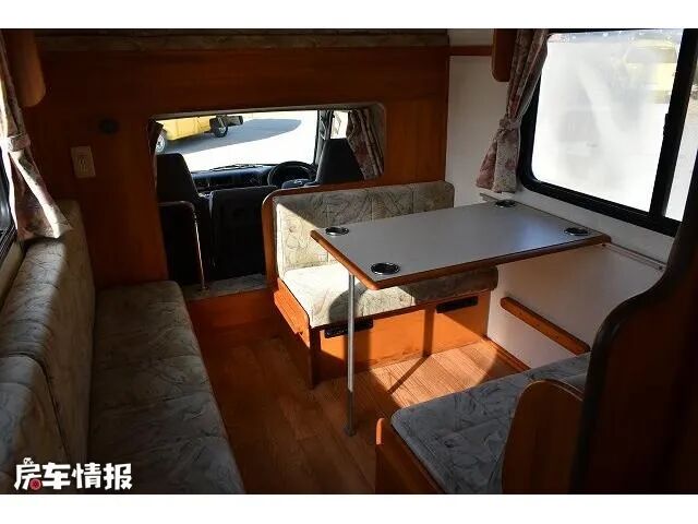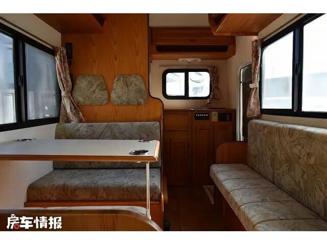 驾驶室与车厢通过中间的木质装饰板分隔开,不过依然可以正常通过,会客区采用对卡座+条型沙发的布局,在行驶过程中对卡座也可以座人,车内总共核载7个人(国产房车通常4-6座,没有7座车型)。