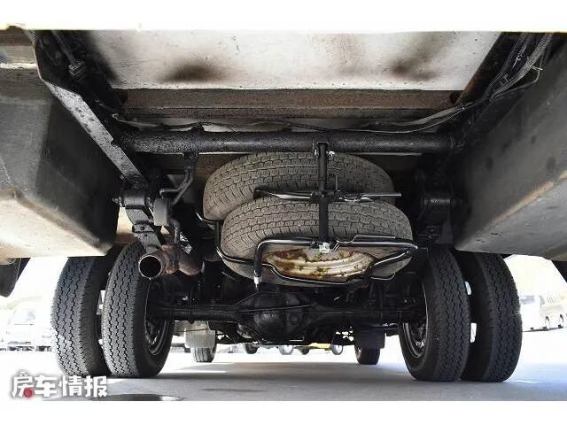 底盘方面配有后双胎,毕竟是卡车底盘,承载力和稳定性方面还是非常不错的,配有两个备胎,拿取的时候恐怕有些费力了。