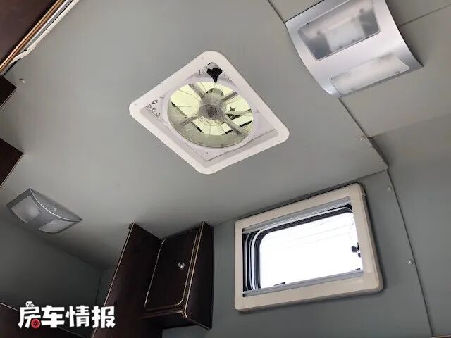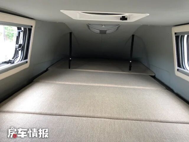 最后便是本车顶部的睡眠区域了,这里有一张1900*1500mm的双人床,顶部有换气扇和顶灯,两侧各有一扇外推窗,可以很好地为车内通风换气、提供光照,在这个空间里也不会很压抑。