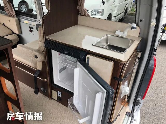 厨房在会客区后方,右侧是一个组合柜,有不锈钢水槽、50L冰箱储物柜,操作台上还有多余的空间,既可以切菜、放置食物,也可以放置一个便携式卡炉,就可以在车内炒菜了,不过建议您在户外炒菜,这样可以避免油污污染车内环境。侧面还可以放置餐桌的桌板,充分利用了车内的空间。