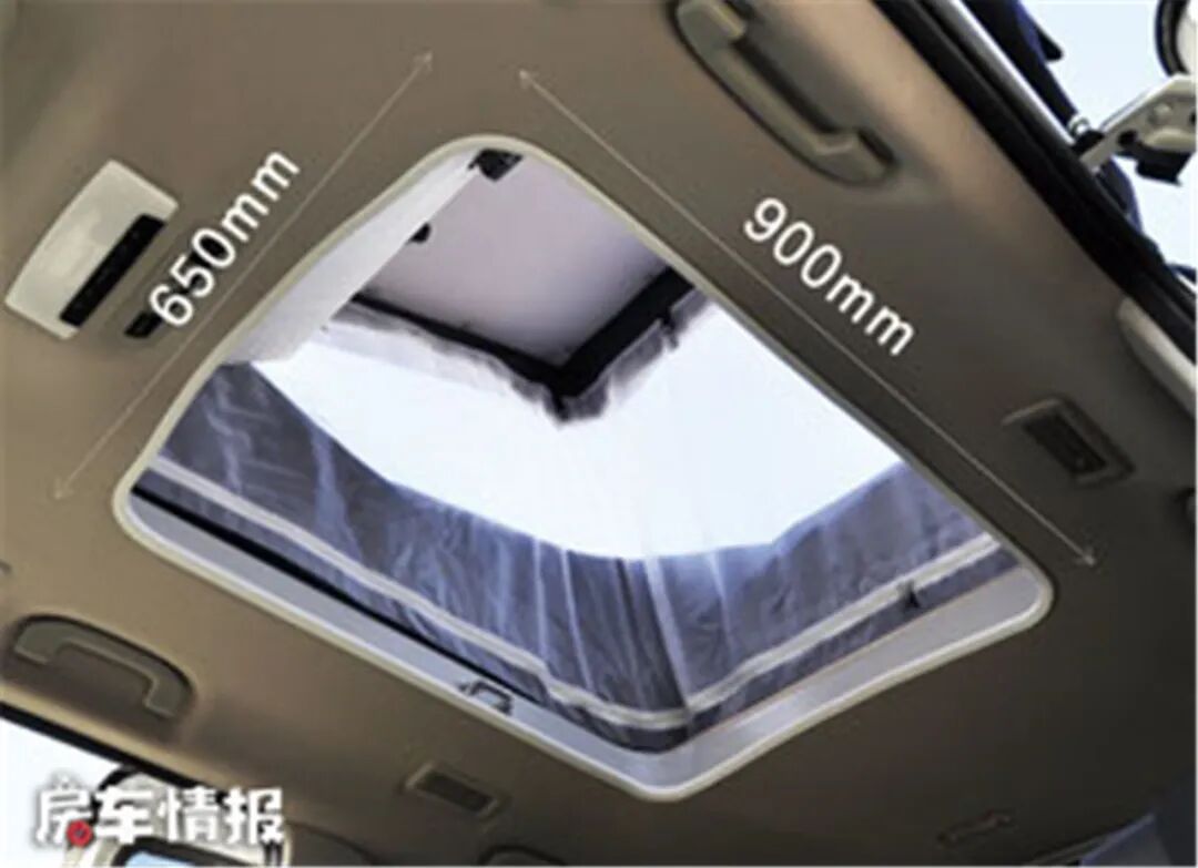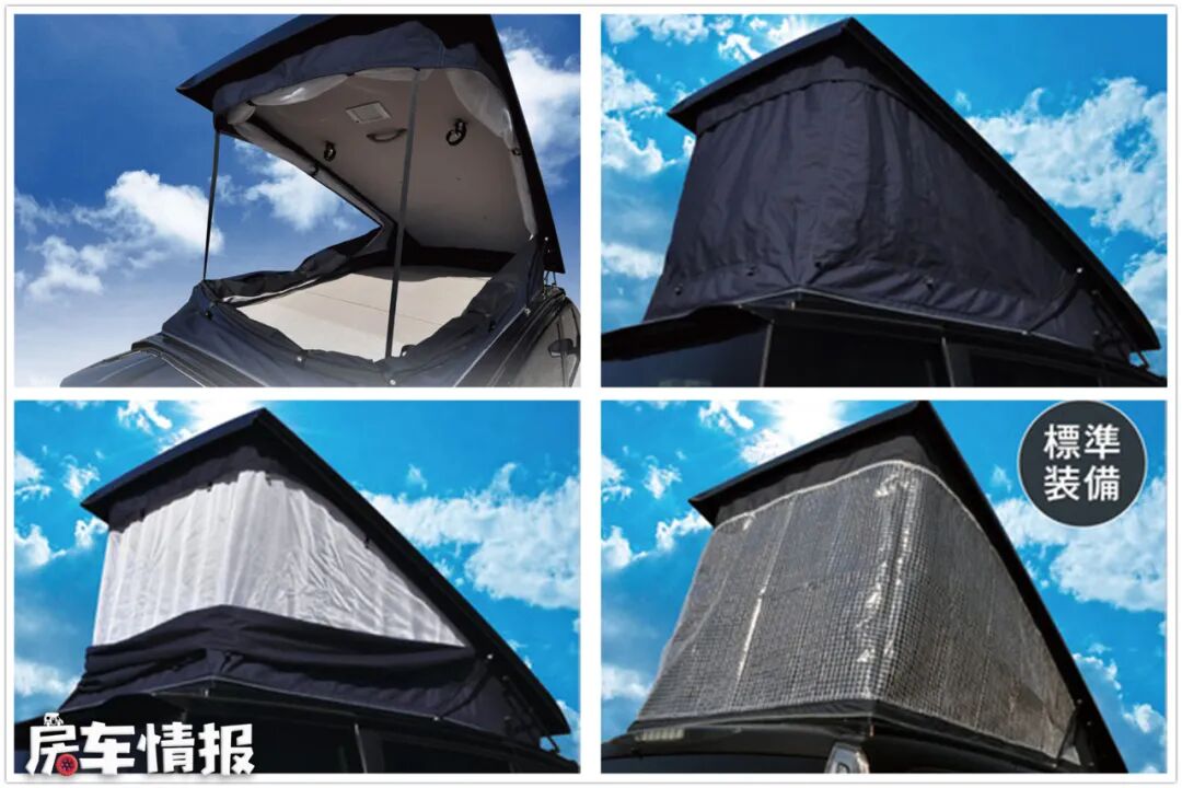 弹出式车顶床的进出方式,可以通过爬梯从车外上下,也可以通过车内顶部预留的900*650mm出入口,方便快捷。升顶帐篷内部带有LED日光灯、防蚊纱帘、遮光帘等生活装备,满足一家人的睡眠需求。