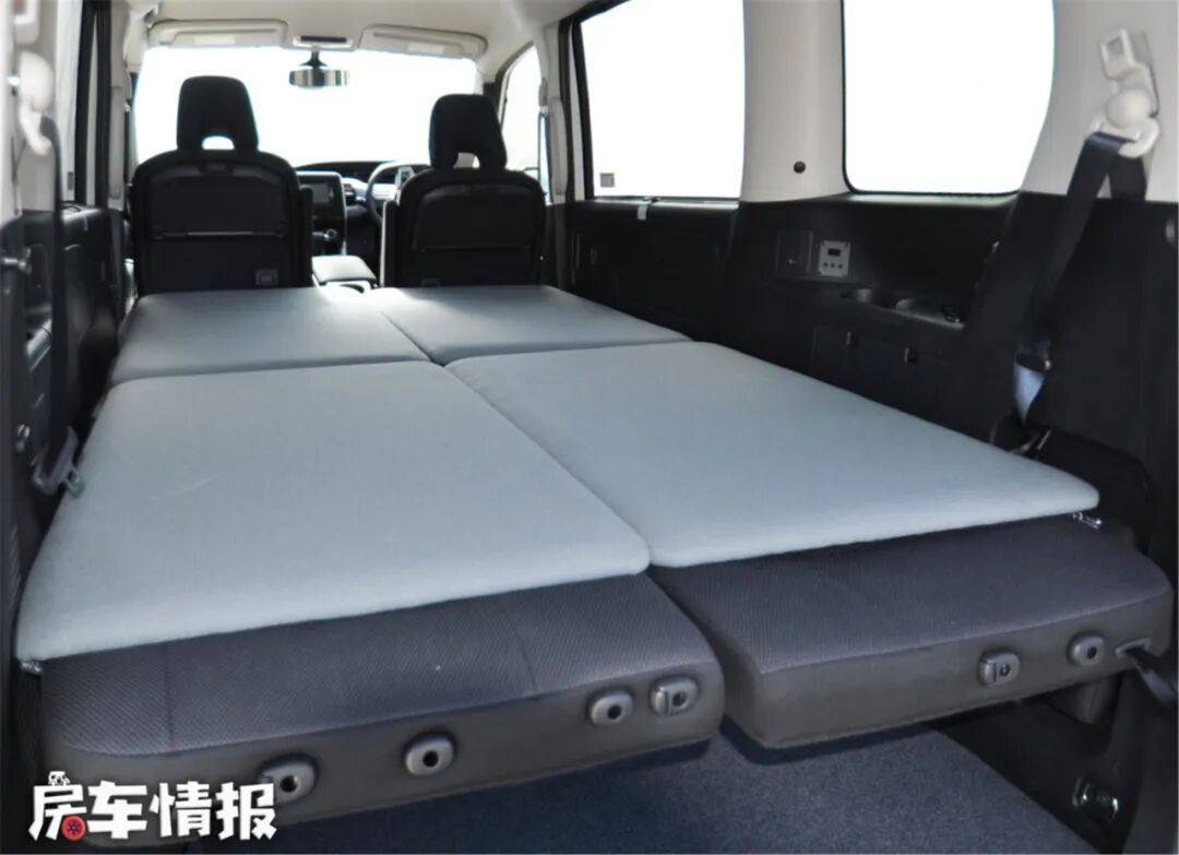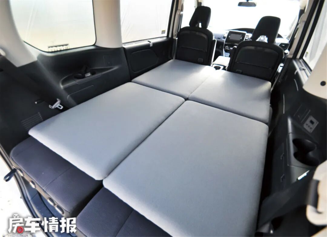 夜晚休息时,可以将后两排座椅全部折叠起来,收纳在车身两侧,不会占多大空间。然后铺上专用的睡眠床垫,或者加装充气床垫,就可以形成大通床。这个超大床铺,能够满足4名成年人休息,还留有足够的富余空间。