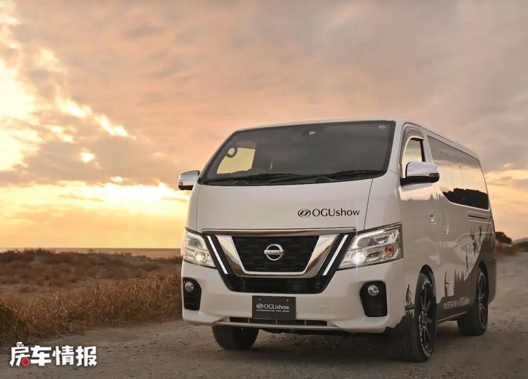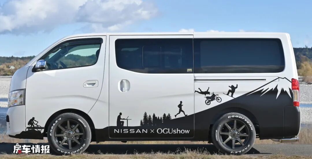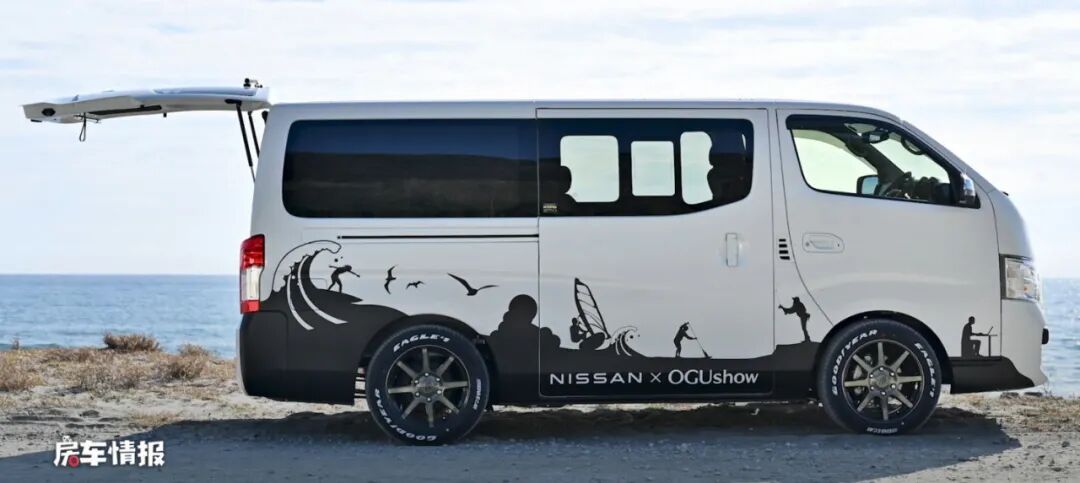 这款房车是由海外房车公司基于日常NV350商务车打造而成的,整车外观一改普通版车型商务沉稳的设计风格,车身两侧加入大画幅的车贴,另整车看起来比较年轻,车轮上这款车也换装了四个运动风格的黑色轮毂搭配上大颗粒的AT越野轮胎,不仅提升了整车下盘的视觉效果,同时对于喜欢到户外野钓的朋友,也能更好地适应不同路况。