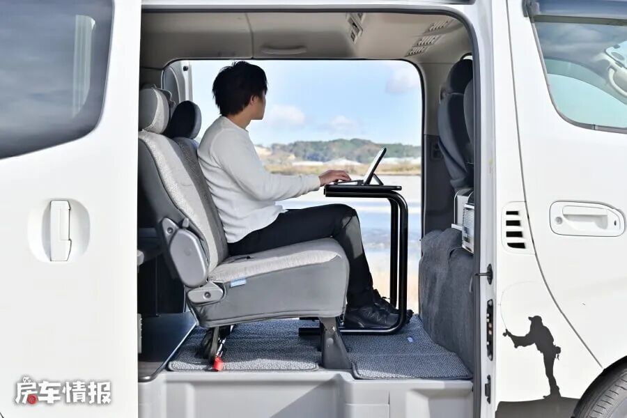 驾驶室后方是一组常规的双人座椅,当把侧滑门全部打开后可以坐在这里欣赏外边的风景,同时也可以利用订制的移动餐桌,在这里简单地办工,回复一下同事的邮件等。