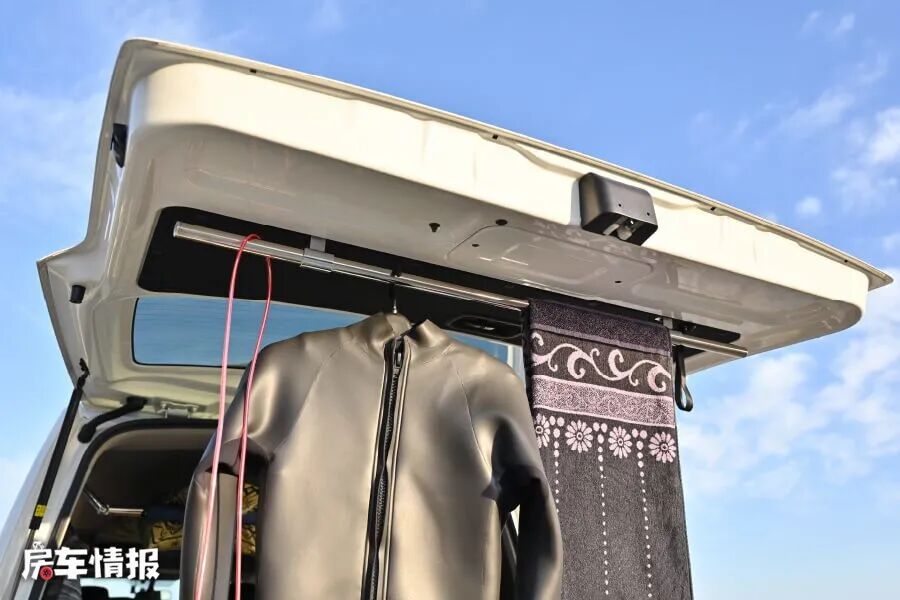 如果是刚洗完的衣服或者潜水服,还可以挂在车尾部相对靠外的横向杆上,这样就不用担心衣服上的水弄到车里了。