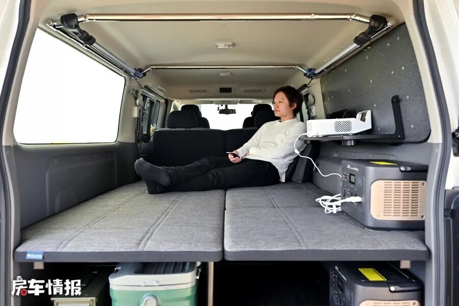 进入车厢内部,可以看到这款车和常见的B型房车相比,显得非常简单,并没有常见的储物吊柜、卡坐沙发、组合式厨房等,反而更像是一辆普普通通的7座商务车。