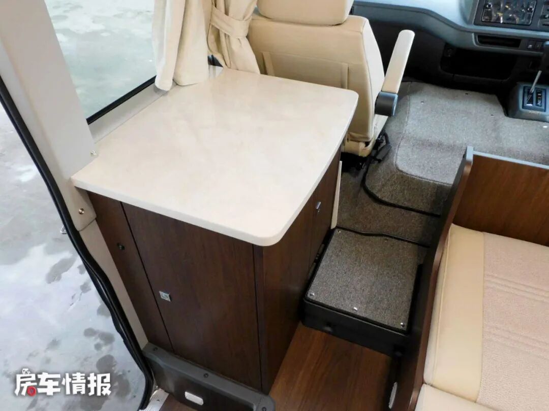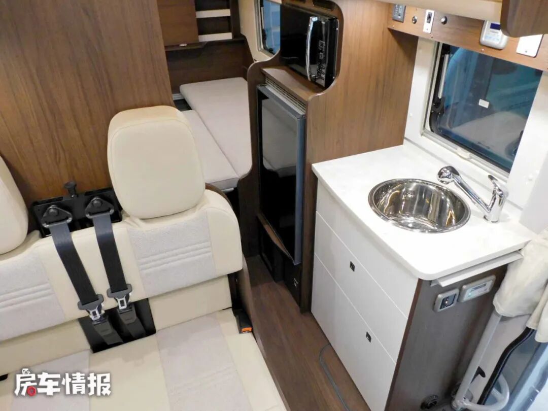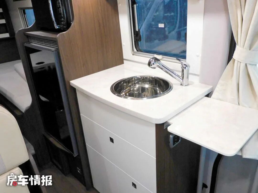 位于车厢中门后方是车内的厨房区域,位于中门左右两侧分别设置了厨房操作台和储物柜,厨房操作台的面积不是很大,提供了洗菜池、冰箱、微波炉等基础设备,想要做饭的话需要单独配备卡式炉,这点和大多数日系房车一样。