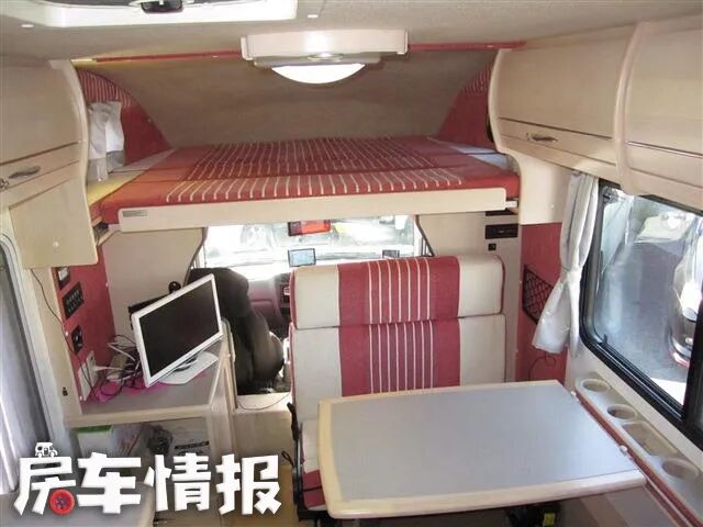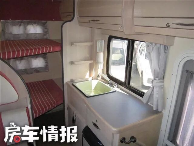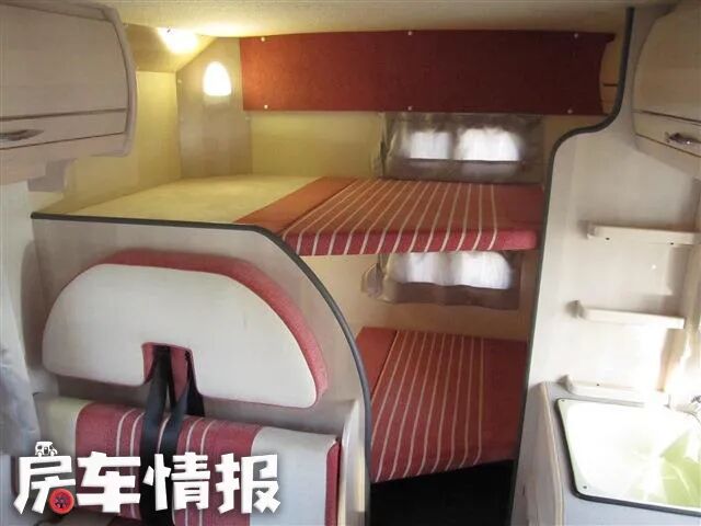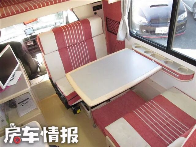 在动力方面,该车搭载的是一台1.8L自然吸气汽油发动机,匹配一部4AT变速箱,动力对比现在的新型房车来说真的不算强劲,而且只提供了两驱系统。进入车厢内部,内饰颜色是呼应外观的红白色,这款房车内部只分为会客区、厨房区和休息区,由于空间有限,并没有设置独立的卫浴区,这点可能是这款房车布局的最大弊端,尤其在夏天的时候,满足不了出行洗漱的基本要求。