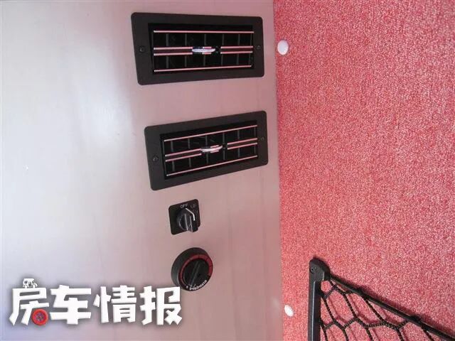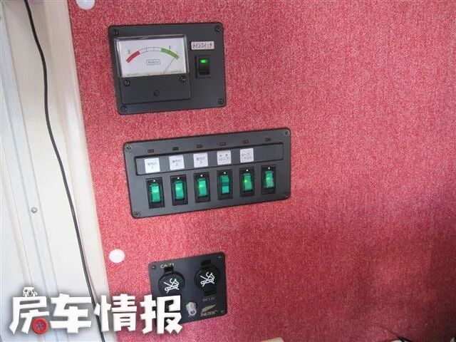在电路系统方面,这款房车的驾驶室后面配备了车内的电路系统显示屏,以及照明等开关控制键。下方还配备了车载自行冷暖空调的开关按钮,冷暖空调这个设备在当时还是很超前的,另外还有减震器、换气扇、监视器、净水箱、污水箱和等一些基础设备。