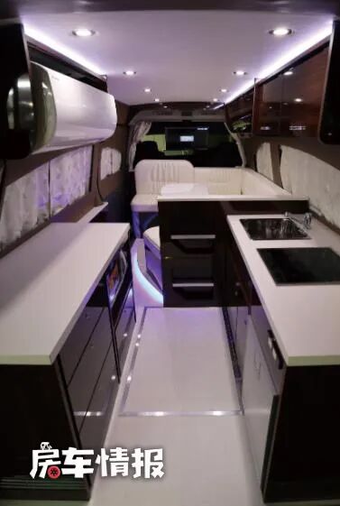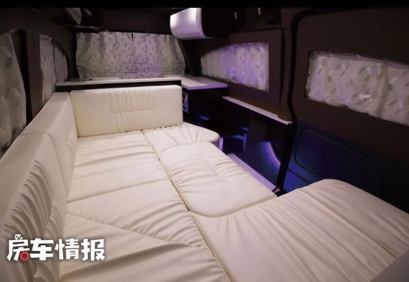 到了晚上,就可以把折叠餐桌放倒,与沙发齐平,形成一张1900*1400(mm)的双人床铺,供晚上休息使用,因为这款房车全部采用了豪华的软皮沙发,所以休息时感觉还是很舒服的。