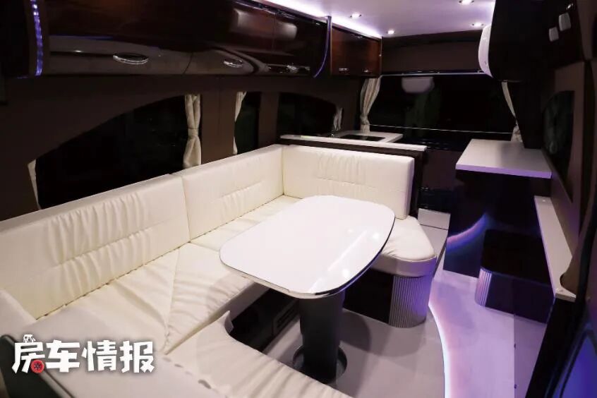 因为B型车自身空间限制的原因,所以这款房车的内部空间比较紧凑,但布局也还算合理,内饰颜色采用了低调的深色系,还配备了防偷窥窗户,虽然采光度不像C型车那么通透,但是整体感觉还是比较豪华的,配上底部一圈紫色的氛围灯带,又给整车增加了一丝神秘感。前方驾驶室的内部设计也延续了日产以往的设计,没有什么变动。