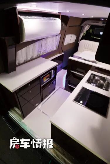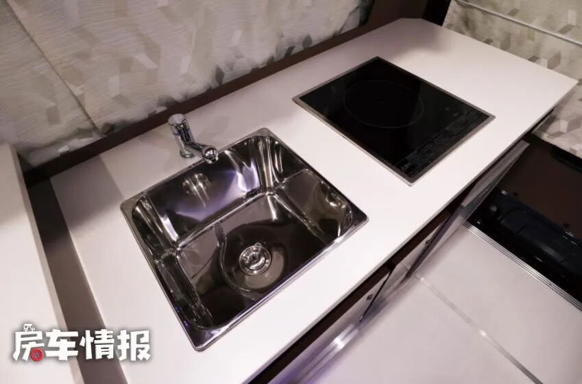 车厢尾部是厨房区,右侧的厨房台面倒是很宽敞,不仅有水槽、电磁炉,旁边还有一块空置的台面可以使用,平时放一些烹饪材料或者其他物品都还不错。台面左下方配备了多个储物抽屉,右下方则放置了一台冰箱供平时使用。