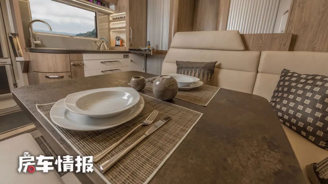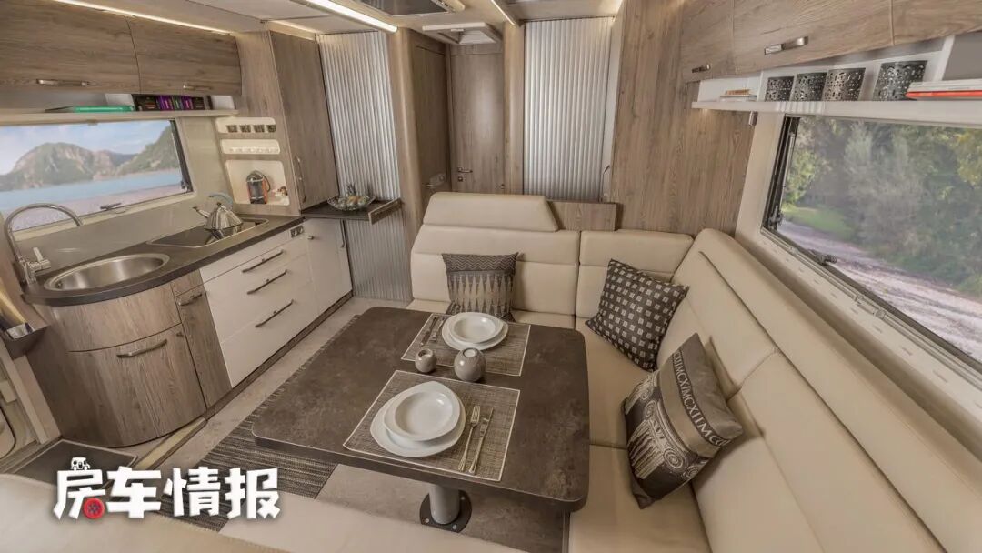 正对乘客门的是会客区,一圈U型软包全皮沙发环绕着一张可折叠的餐桌,整张沙发可坐5-6人,空间很大,可满足一家人围绕在餐桌前小聚娱乐,到了晚上可以搭建成一张双人床供休息使用,会客区上方还提供了一排储物柜,平时储存一些物品。