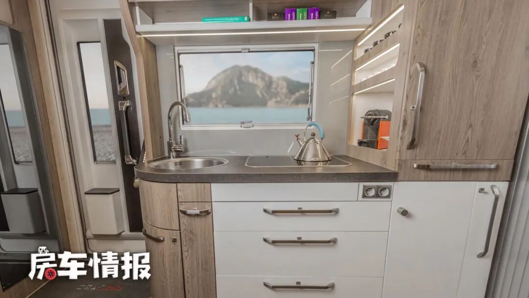 会客区对面是厨房区,因为厨房区在拓展的部分里,所以相较于其他普通C型房车来说,这款房车的厨房操作台足够大,台面达到了125*58(mm),其中包括一个燃器灶台、160L的冰箱、水槽和一个额外可拉出式工作台。厨房区还提供了多层抽屉和橱柜用于存放物品,其中包括一个可用于放置微波炉或者烤箱的空间。