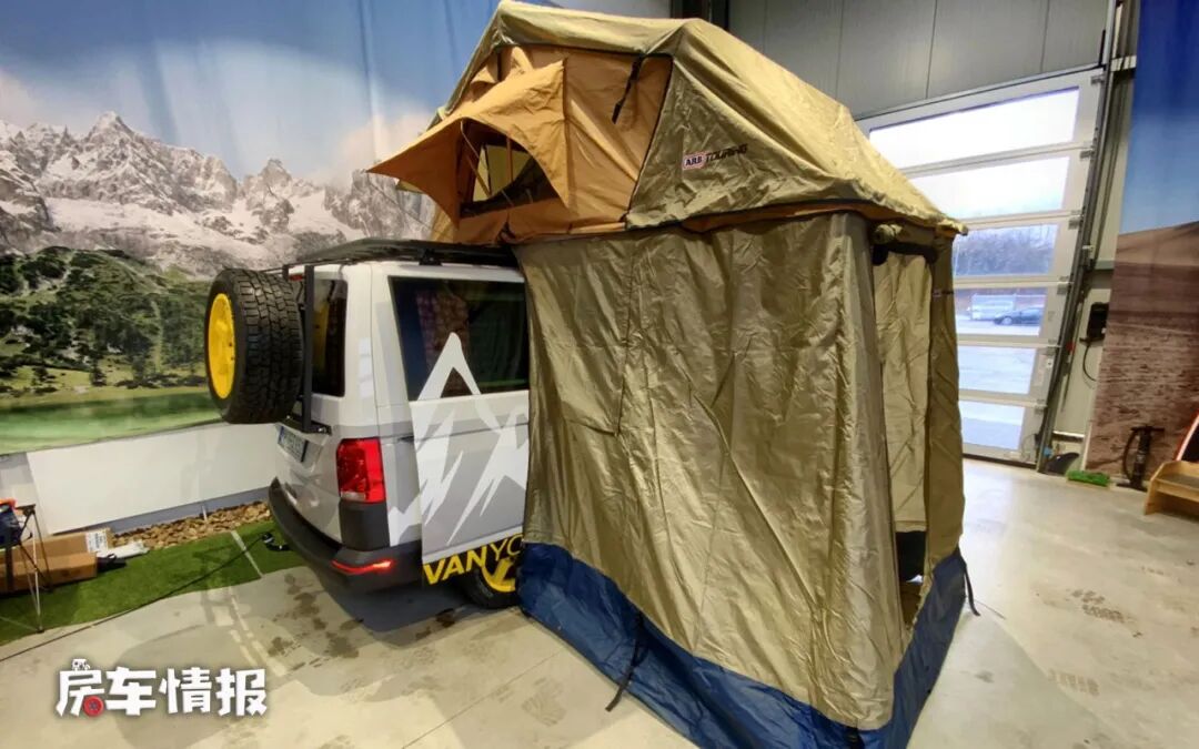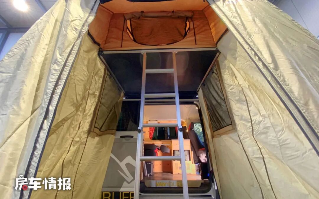 上面说了这款房车是一款造型独特的房车,独特之处就在于将车顶的顶篷升起来之后,外面可以加装一个外置的帐篷,这样就可以搭建出一个车外的休息区,节省了车内的使用空间,这个想法确实很奇特,但是有利就有弊,这样一来保暖效果也就大打折扣,冬天的时候还是不推荐使用车身外的帐篷用来休息,而且车外的帐篷属于选配,需额外加钱。