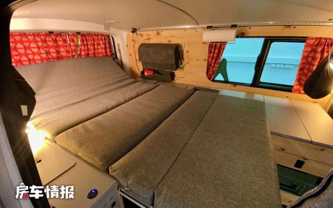 休息区更为简易,需要把会客区的座椅放倒,将后方的床垫铺平,形成一个双人床铺,如果想睡四个人,需要后期加钱选配车外帐篷,所以说这款房车更适合一个人或一对情侣使用。