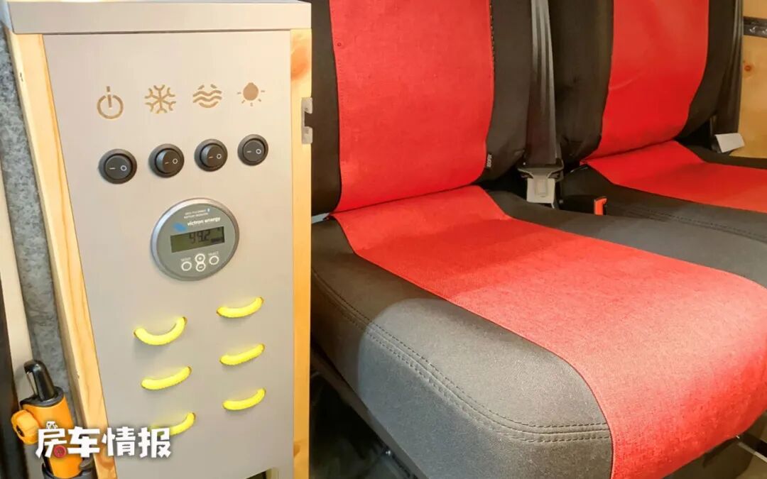 电路方面,这款房车搭载了一台90Ah的锂电池和300W逆变器,还配备了120W的太阳能充电系统,基本能够满足两个人的用电需求。